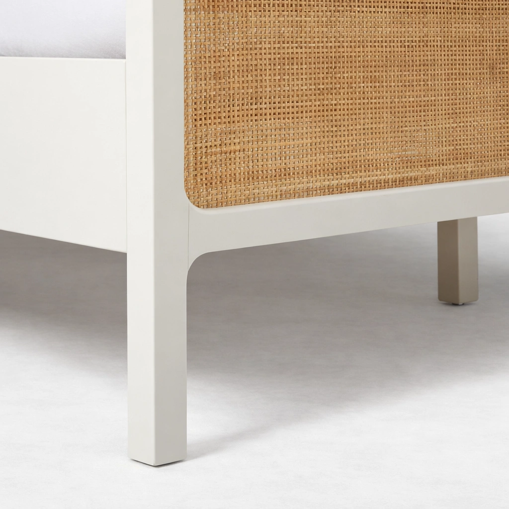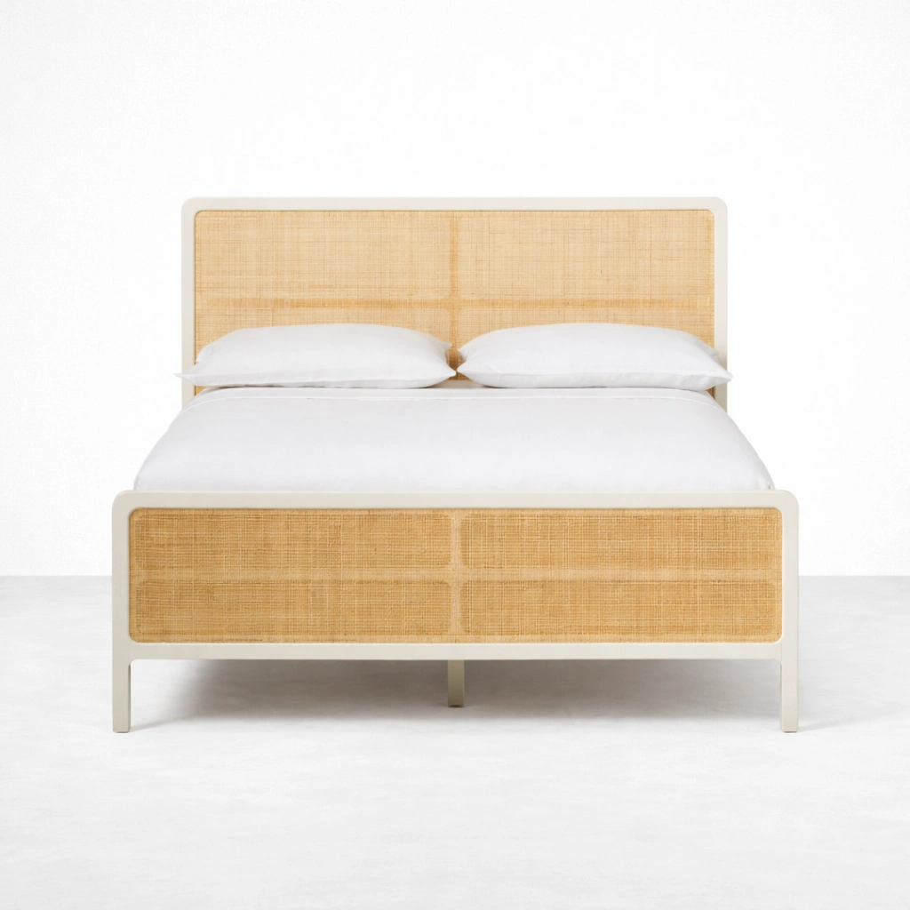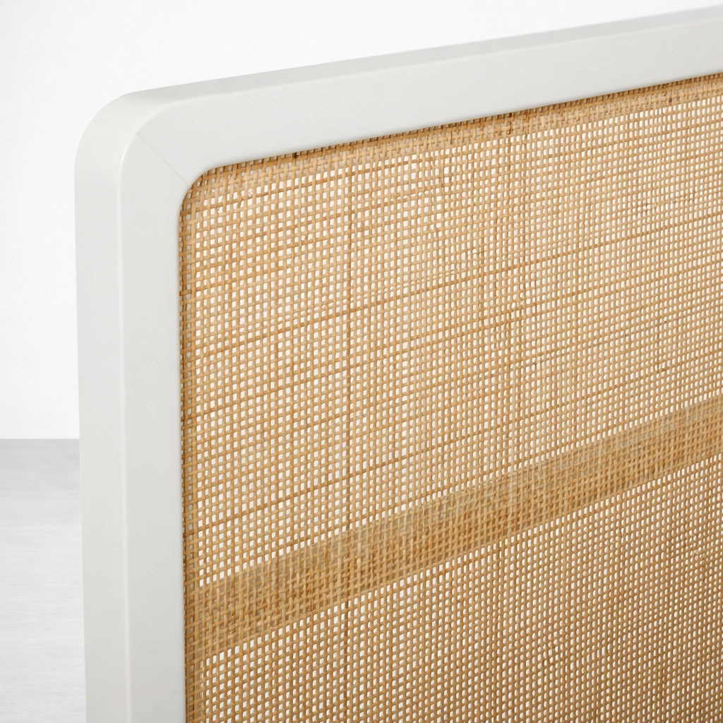 The INTERIORZE Aira cane panel bed is designed for bedrooms that feel bright and balanced. The natural cane panels add warmth and texture, while the smooth ivory frame keeps the overall look neat and modern. With a matching cane headboard and footboard, this bed creates a cohesive statement without feeling heavy.