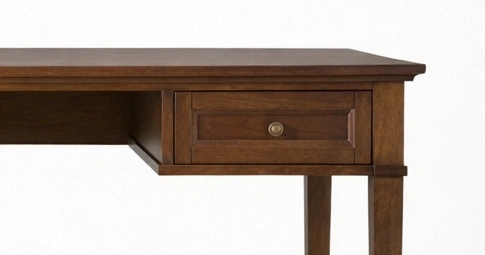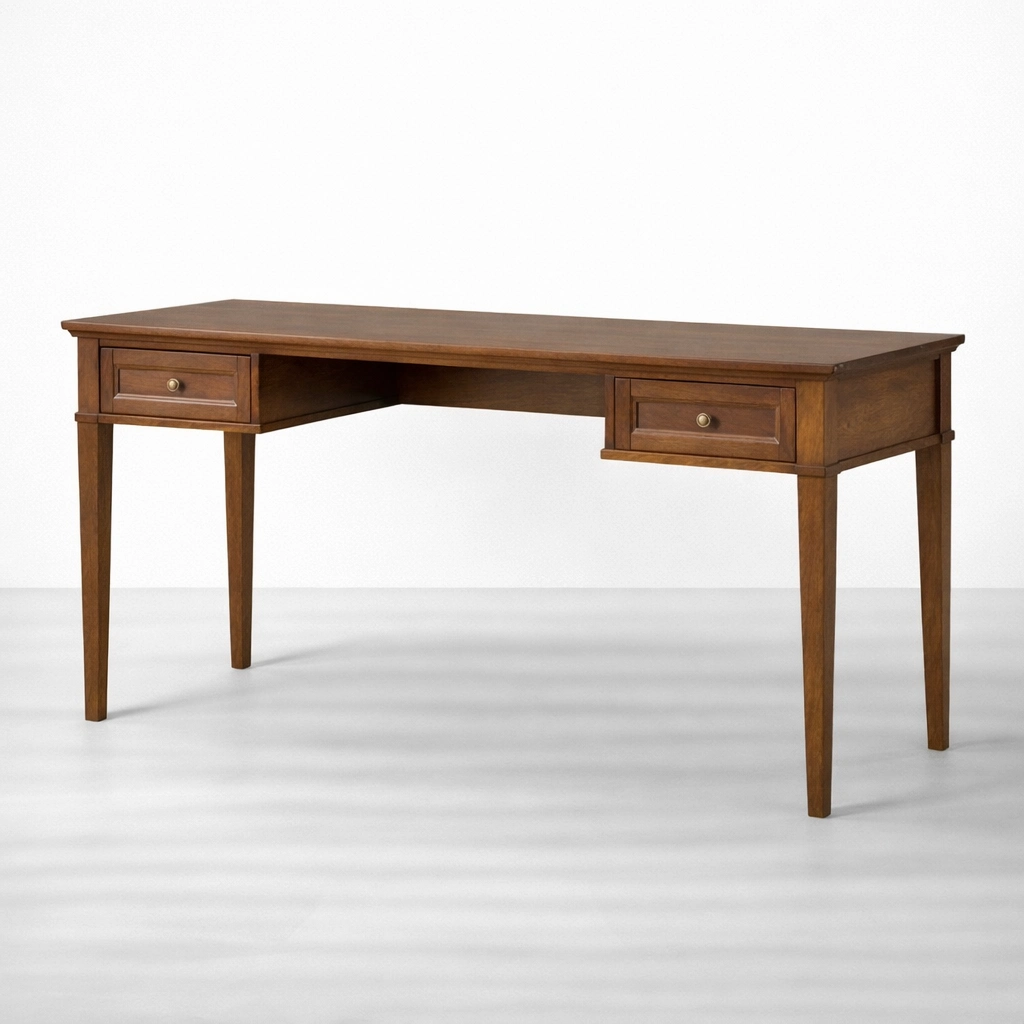 Its straight profile and tapered legs create a neat visual balance, while the drawer layout offers convenient storage for stationery, notebooks, papers, chargers, and daily work essentials. The warm walnut brown polish highlights the natural grain of the wood and gives the desk a composed, timeless character suitable for regular use.