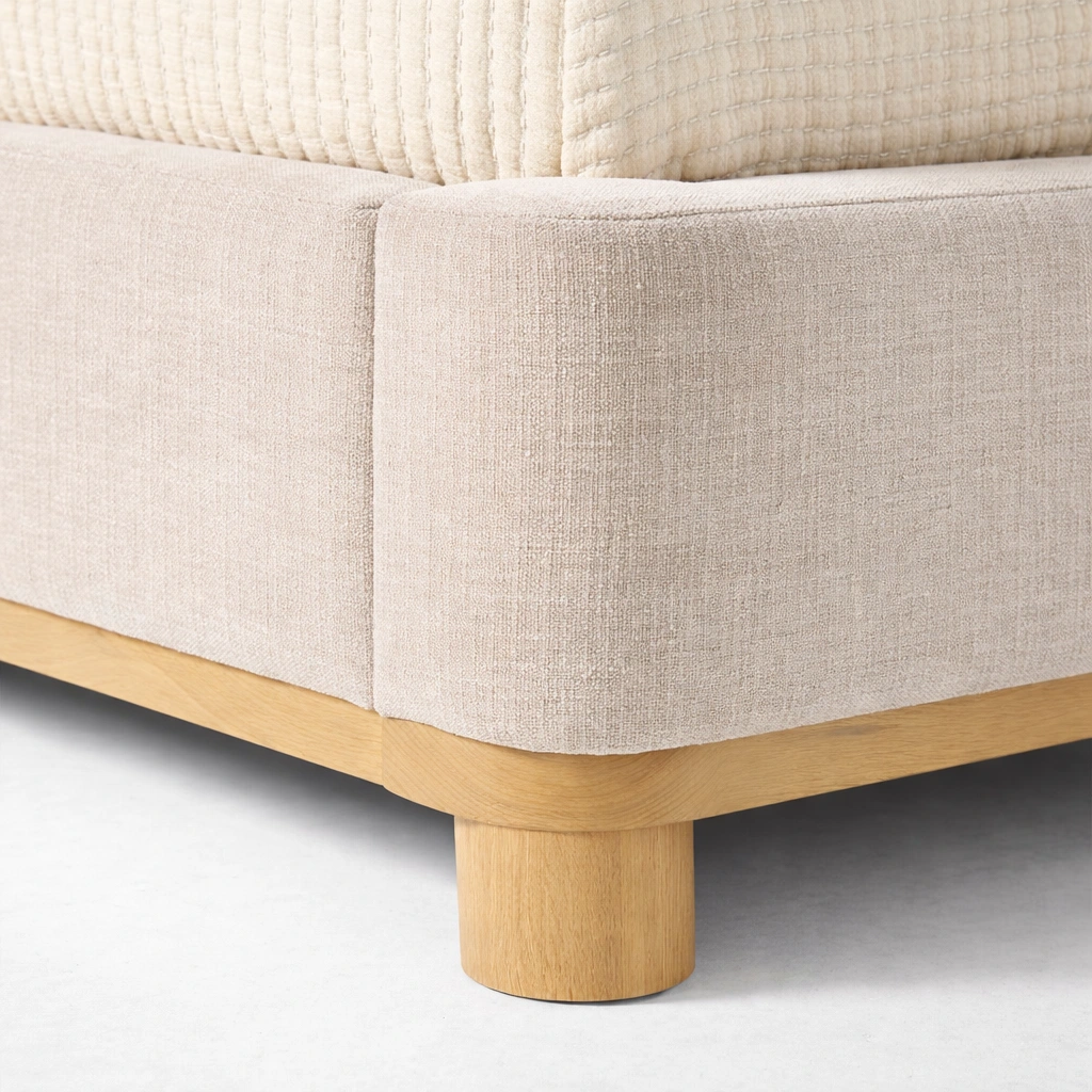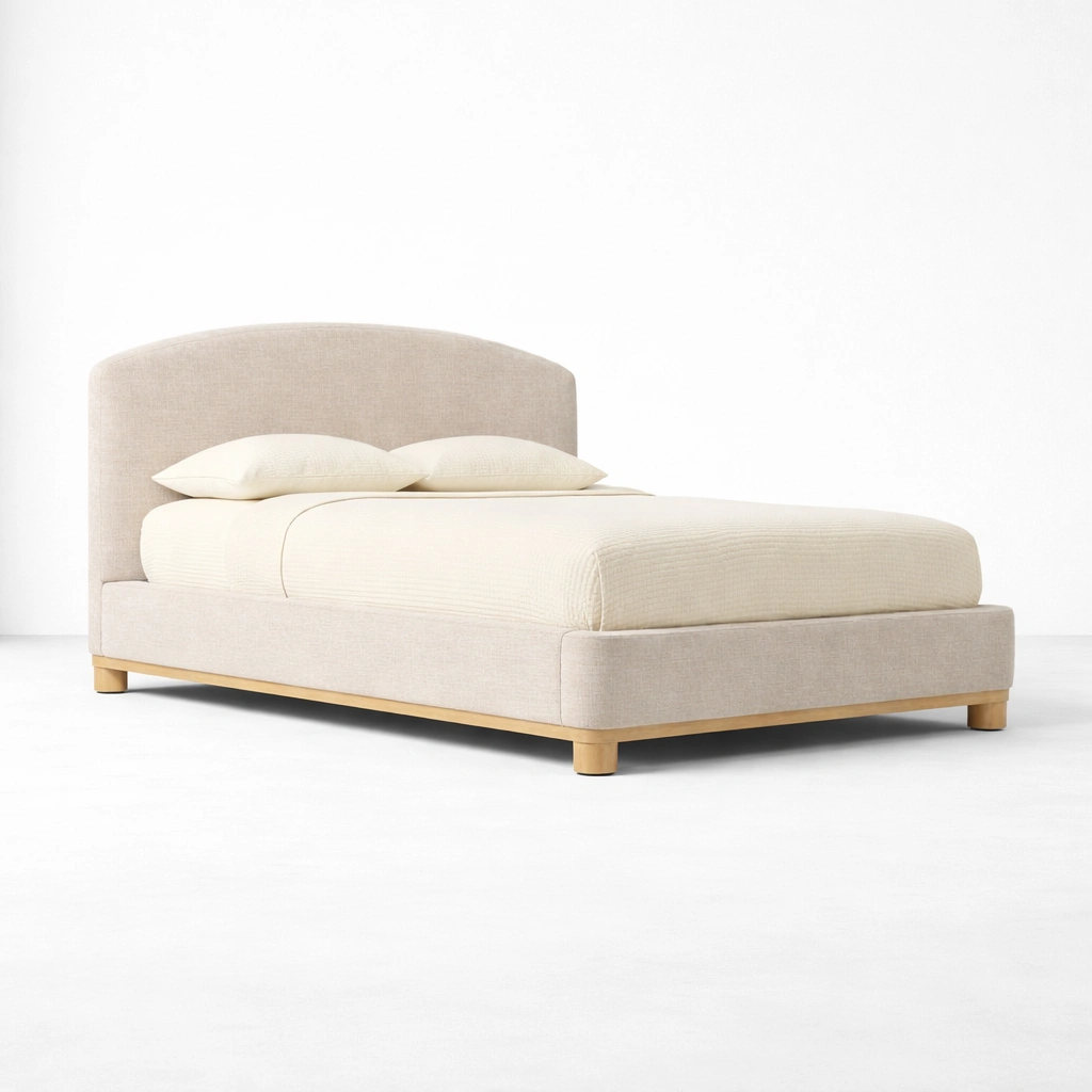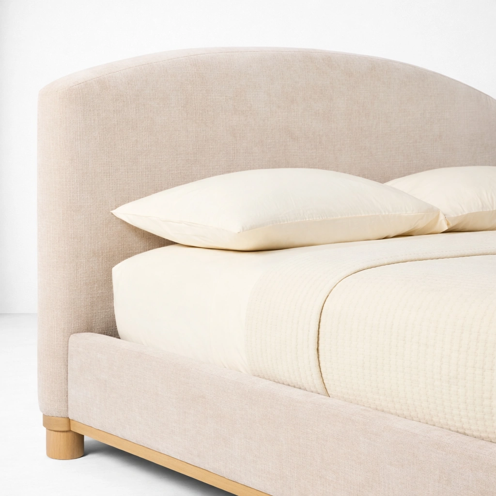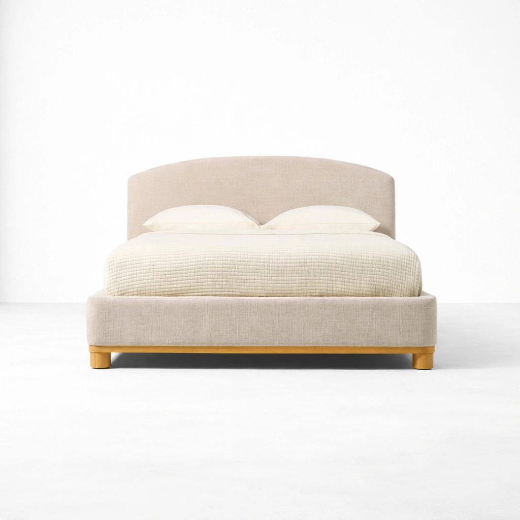 The INTERIORZE Arcadia upholstered teakwood bed is designed to bring comfort and calm into the bedroom. The arched headboard adds a gentle, balanced shape, while the upholstered frame creates a smooth, tailored look that suits modern, minimal, and warm-neutral interiors upholstered teakwood bed.