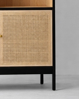 Its ash wood surface brings warmth and a light welcoming character to the room, while the contrasting black outer frame adds depth and definition to the overall design. The arched upper profile, balanced shelf layout, and woven cane shutters create a graceful combination of open display and enclosed storage, making it easy to place in both modern and transitional interiors.