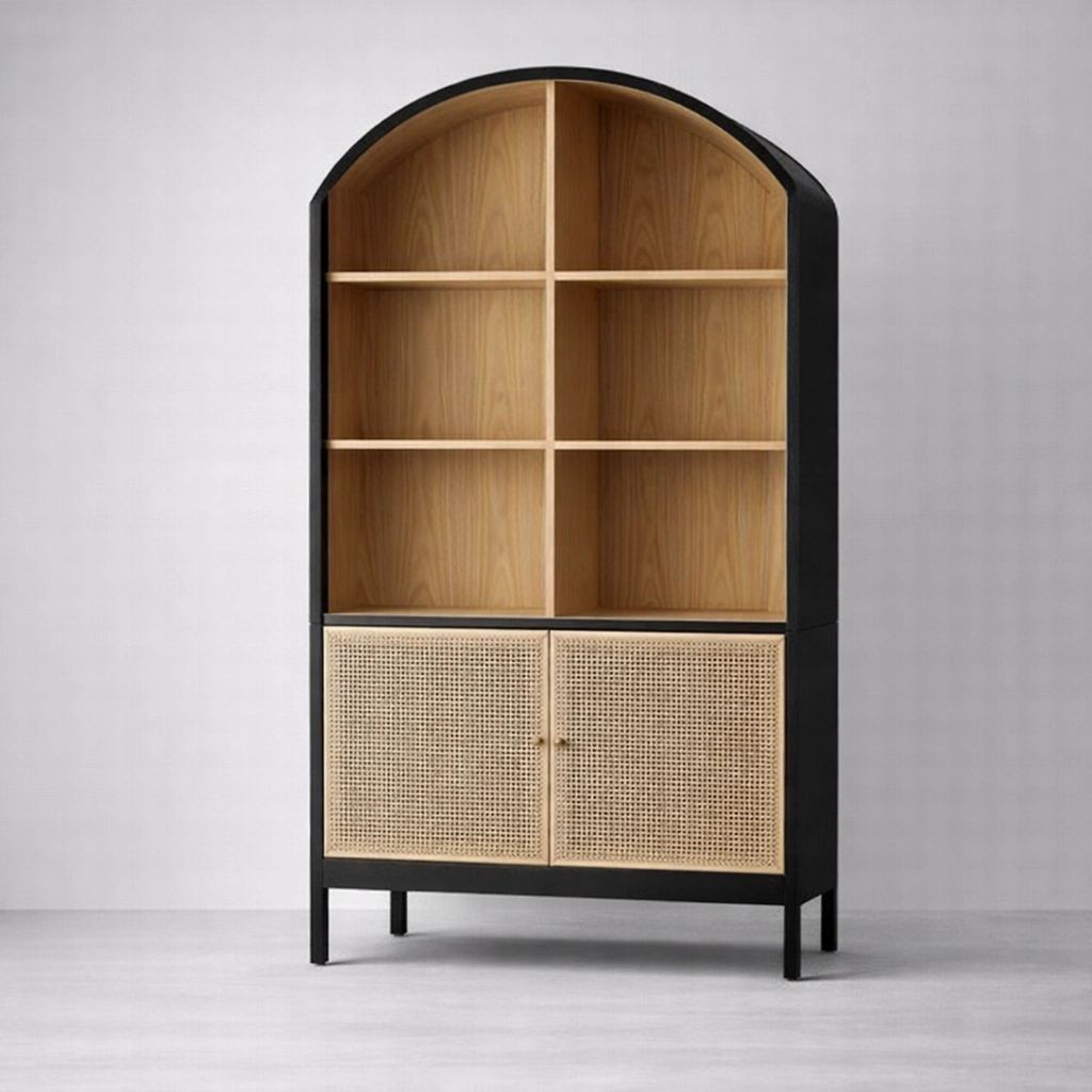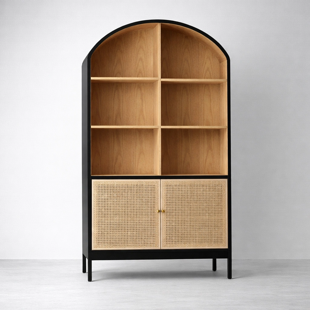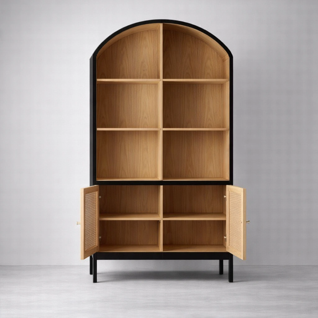 This arched cane ash wood showcase cabinet offers useful everyday storage for books, décor accents, collectibles, tableware, planters, candles, and styled essentials. The open upper shelves allow decorative display, while the lower cabinet keeps utility items neatly stored and visually concealed, making it suitable for living rooms, dining spaces, bedrooms, study corners, and carefully styled residential interiors.