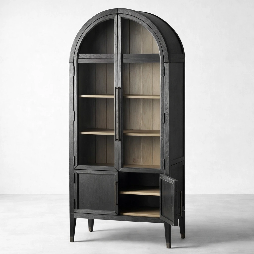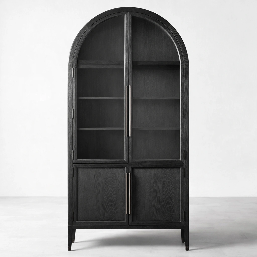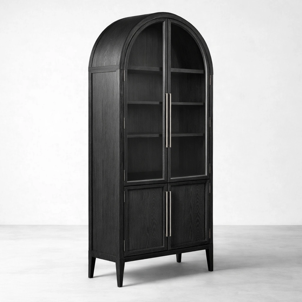 The form of the Arlen Black Arched Wood Showcase Cabinet is simple, but its curved upper frame, deep black finish, glass-front display section, and lower paneled doors give it a distinctive identity. The slim vertical handles and raised leg base add to its refined character, helping the cabinet feel elegant, practical, and timeless.