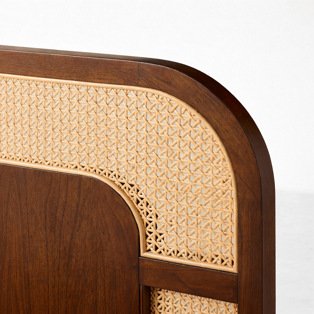 Elegant curved headboard design with woven cane detailing
