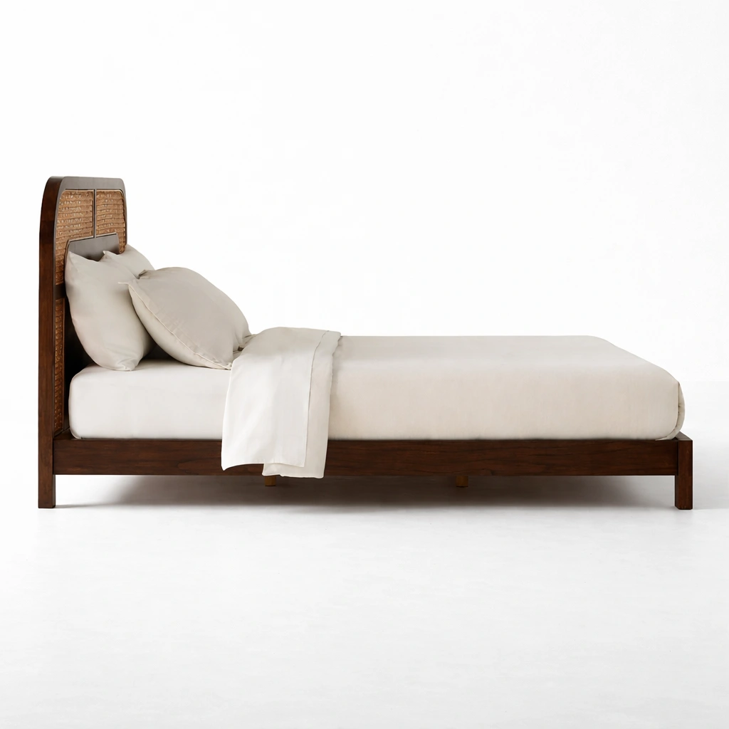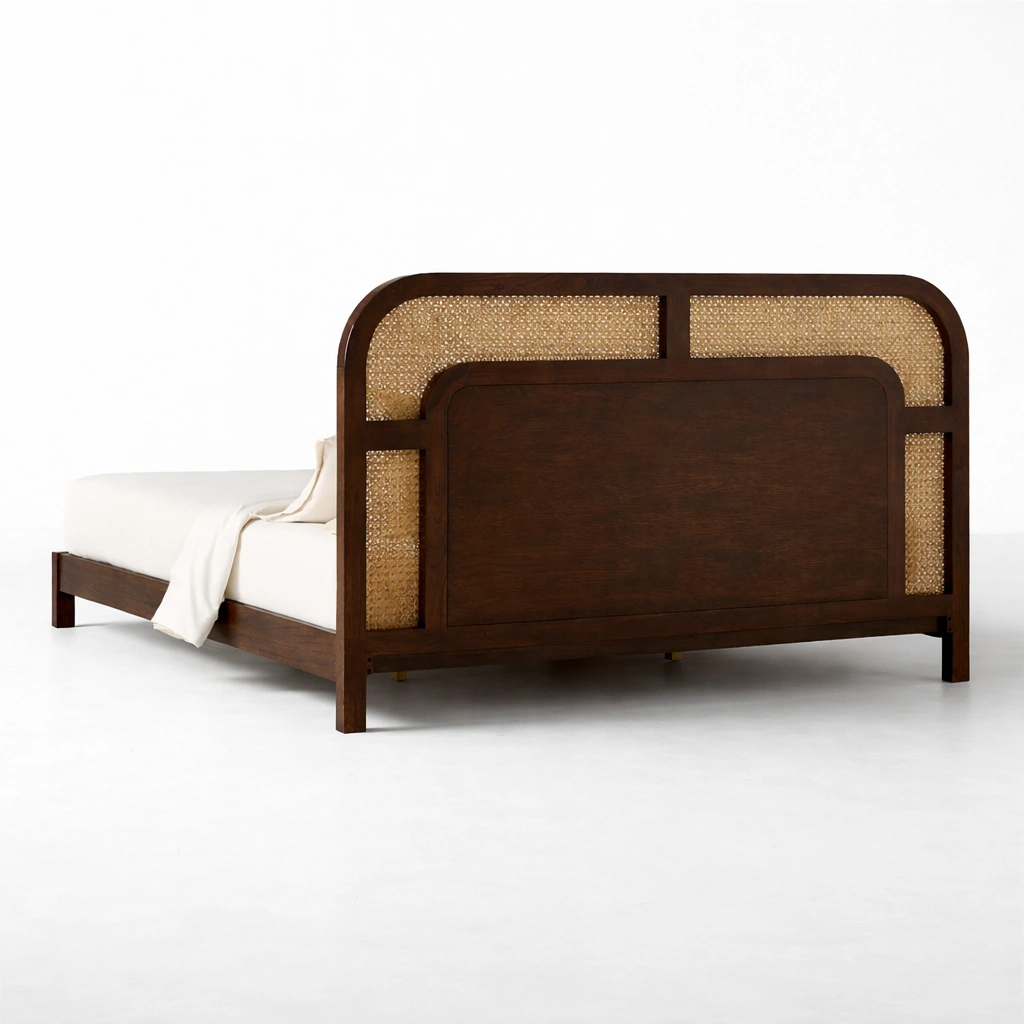 The Arinya bed highlights the natural beauty of wood grain along with the handcrafted look of cane weaving. The rounded headboard frame gives the bed a soft and premium appearance, while the woven cane panels add texture and visual warmth. The frame is simple and balanced, making it suitable for both compact and spacious bedrooms.
