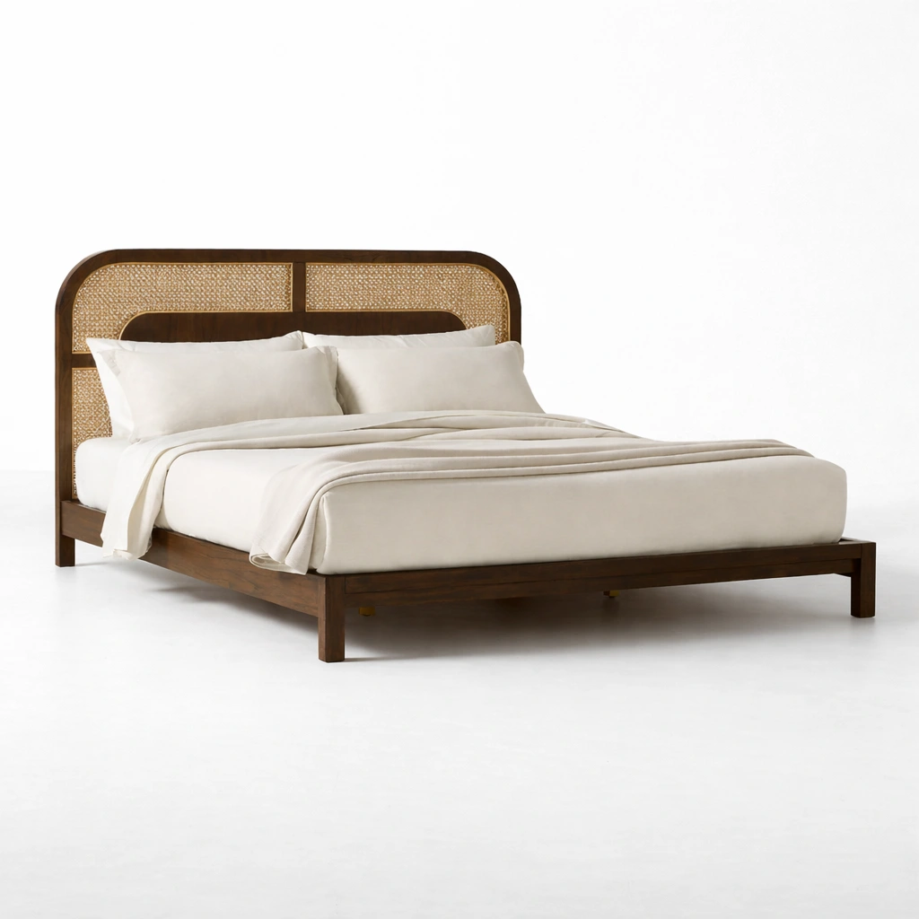 The INTERIORZE Arinya teakwood cane headboard bed is designed for customers who prefer a warm wooden finish with natural texture and timeless detailing. This teakwood cane headboard bed features a beautifully curved headboard profile, woven cane panels, and a clean wooden frame that suits modern, classic, and transitional bedrooms.