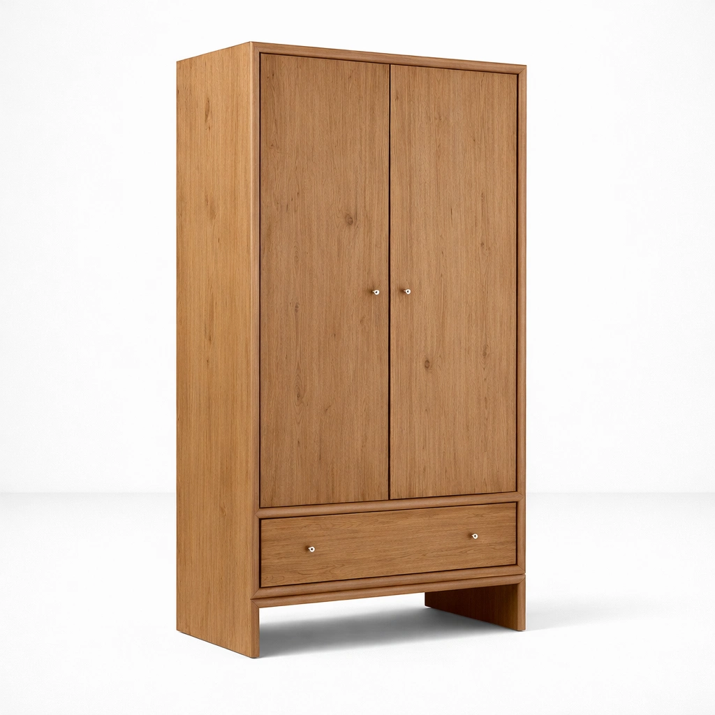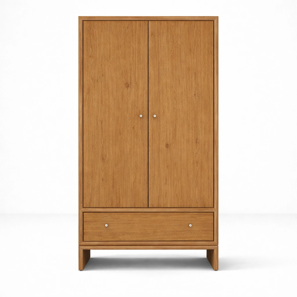 Arlo teak wardrobe is thoughtfully designed for homes that need practical storage in a clean and timeless form. Crafted in teak wood, this wardrobe combines a spacious hanging area, a useful lower shelf, and a bottom drawer within one balanced silhouette. The straight profile, warm wood tone, and minimal detailing make it easy to place in bedrooms, guest rooms, apartments, and calm residential interiors.