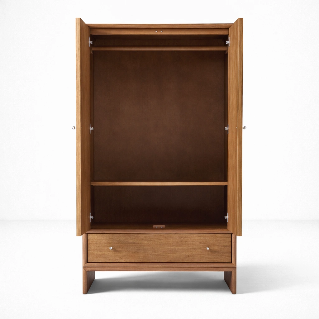 The upper section offers generous hanging space for shirts, jackets, dresses, and occasion wear, while the lower shelf creates extra room for folded garments, bags, boxes, or daily essentials. The bottom drawer adds one more layer of concealed storage, making the piece suitable for both regular use and seasonal organization. Its layout is simple, practical, and easy to maintain for everyday living arlo teak wardrobe.