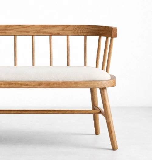 This ash spindle bench can be placed in an entryway, at the dining side, near a window, in a bedroom, or in a styled living area. It works especially well in homes where natural wood finishes, soft upholstery, and understated elegance are preferred. The upholstered top makes the bench more comfortable for longer sitting, while the wooden structure keeps the overall look clean and timeless.