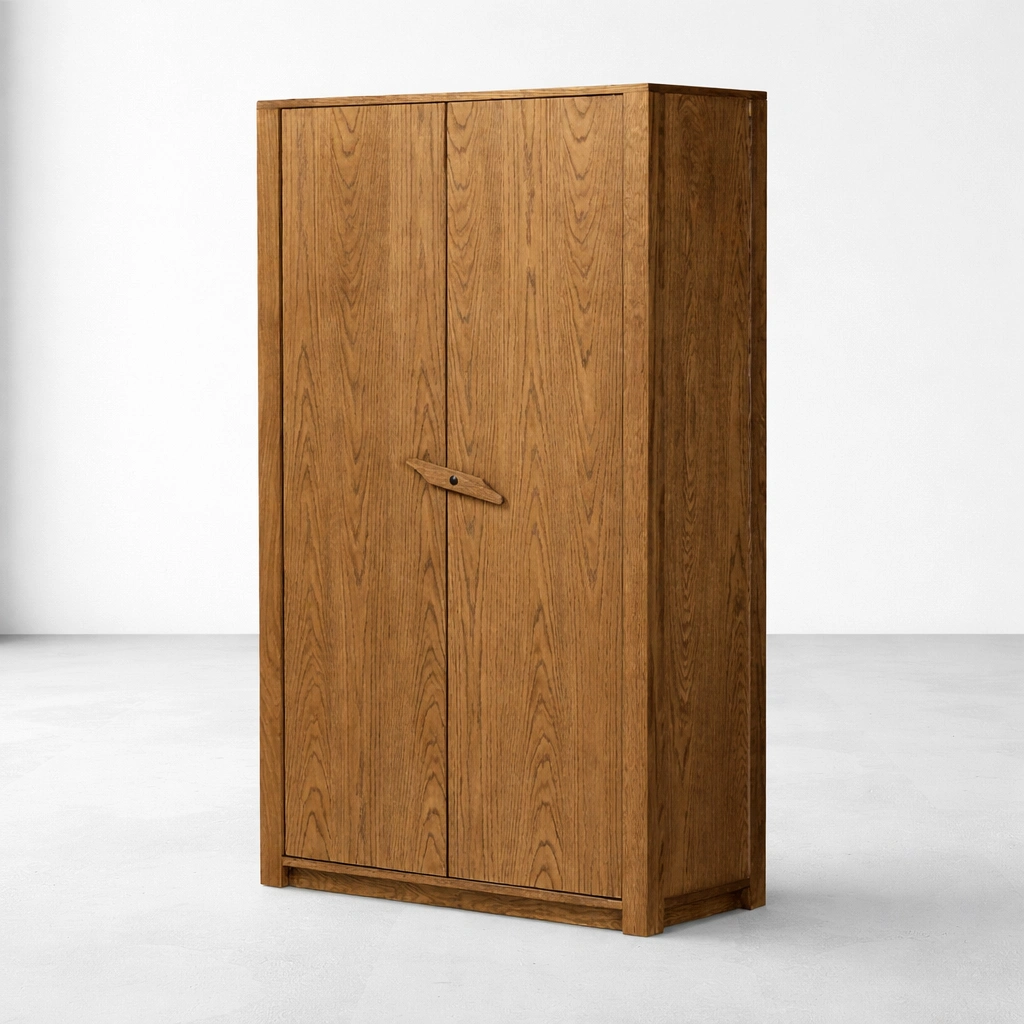 Ash wood 2 door wardrobe is thoughtfully designed for interiors that value warm wood character, simple storage, and timeless furniture styling. Its tall rectangular profile, clean door fronts, and signature angled wooden latch create a strong yet balanced look that feels both practical and visually calm.