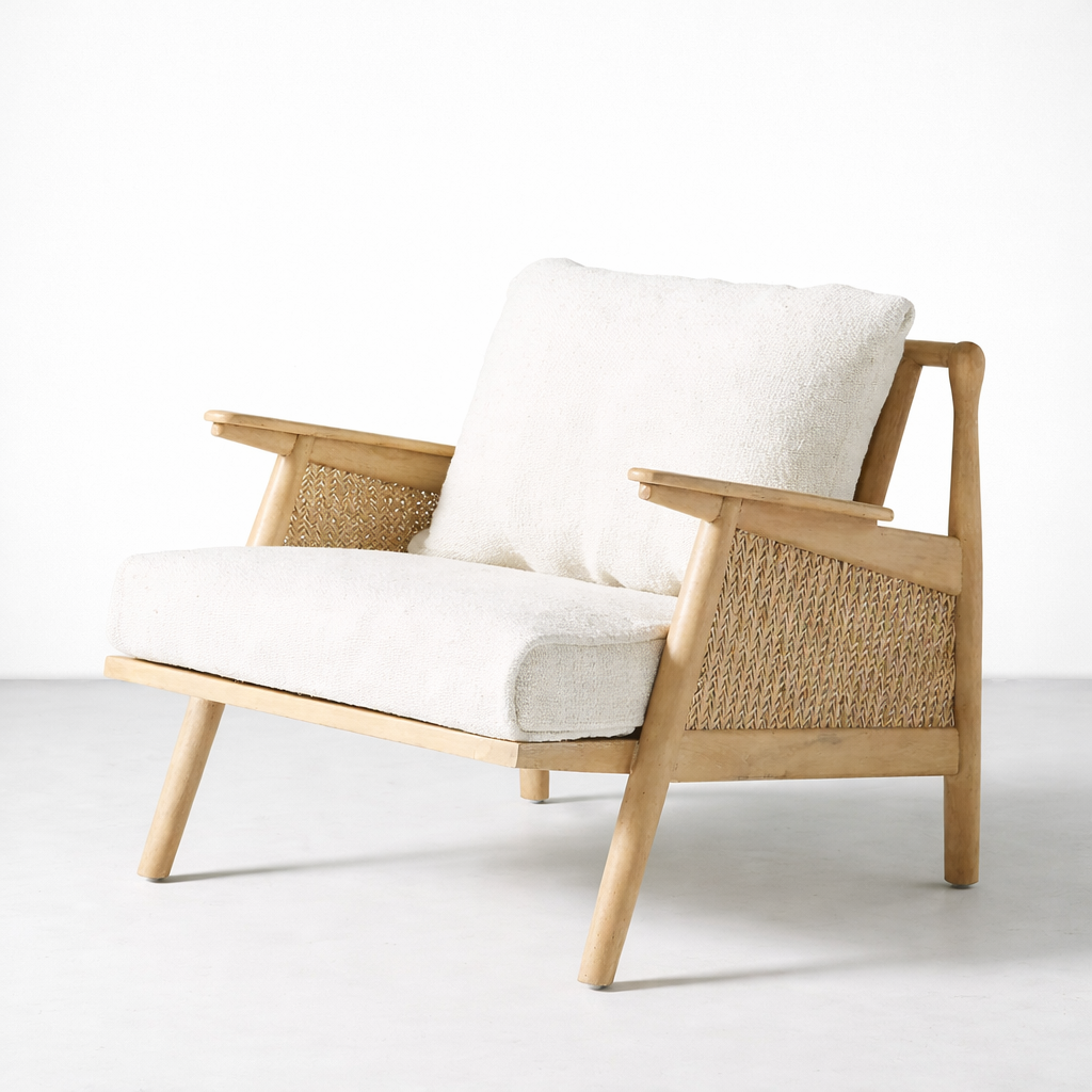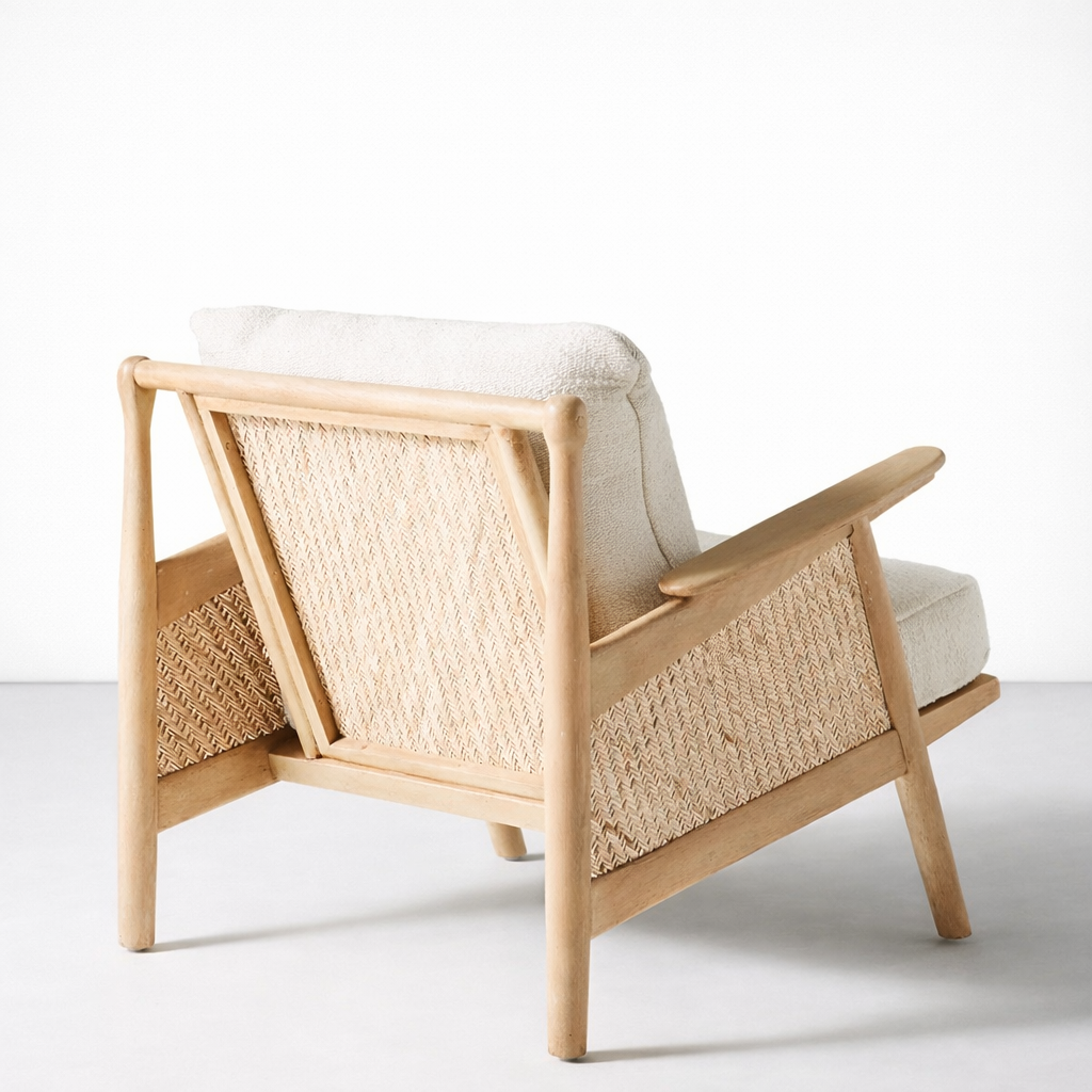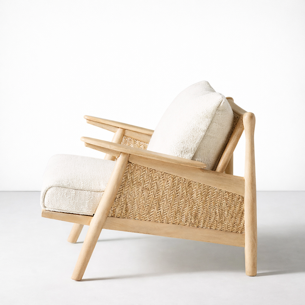 The INTERIORZE ash wood cane lounge chair in cream is designed to bring warm, relaxed style into your home, combining a solid ash wood frame with gently rounded edges and handwoven cane side and back panels that add rich texture and airflow from every angle; the deep seat and generous back cushion are upholstered in soft cream fabric and filled with high-density foam so this ash wood cane lounge chair feels as comfortable as it looks, offering a laid-back recline that is ideal for living rooms, reading corners, bedrooms and studio spaces; the pale ash wood with its natural matte polish highlights the grain and pairs easily with neutral rugs, wooden coffee tables and Scandinavian or coastal inspired interiors, while the cane pattern keeps the profile light and airy; crafted by skilled artisans, each ash wood cane lounge chair is made to order, allowing you to customize the ash wood finish from natural to light oak or deeper walnut tones, adjust the overall width, depth or seat height to suit your layout, and choose alternate fabric colors or textures for the cushions, making this ash wood cane lounge chair a versatile choice for homes, cafés, boutique hotels and designer projects that value both craftsmanship and comfort; with its sturdy construction, comfortable proportions and timeless mix of ash wood, cane and cream upholstery, this ash wood cane lounge chair becomes an easy go-to seat for everyday use while acting as a subtle statement piece in any space.