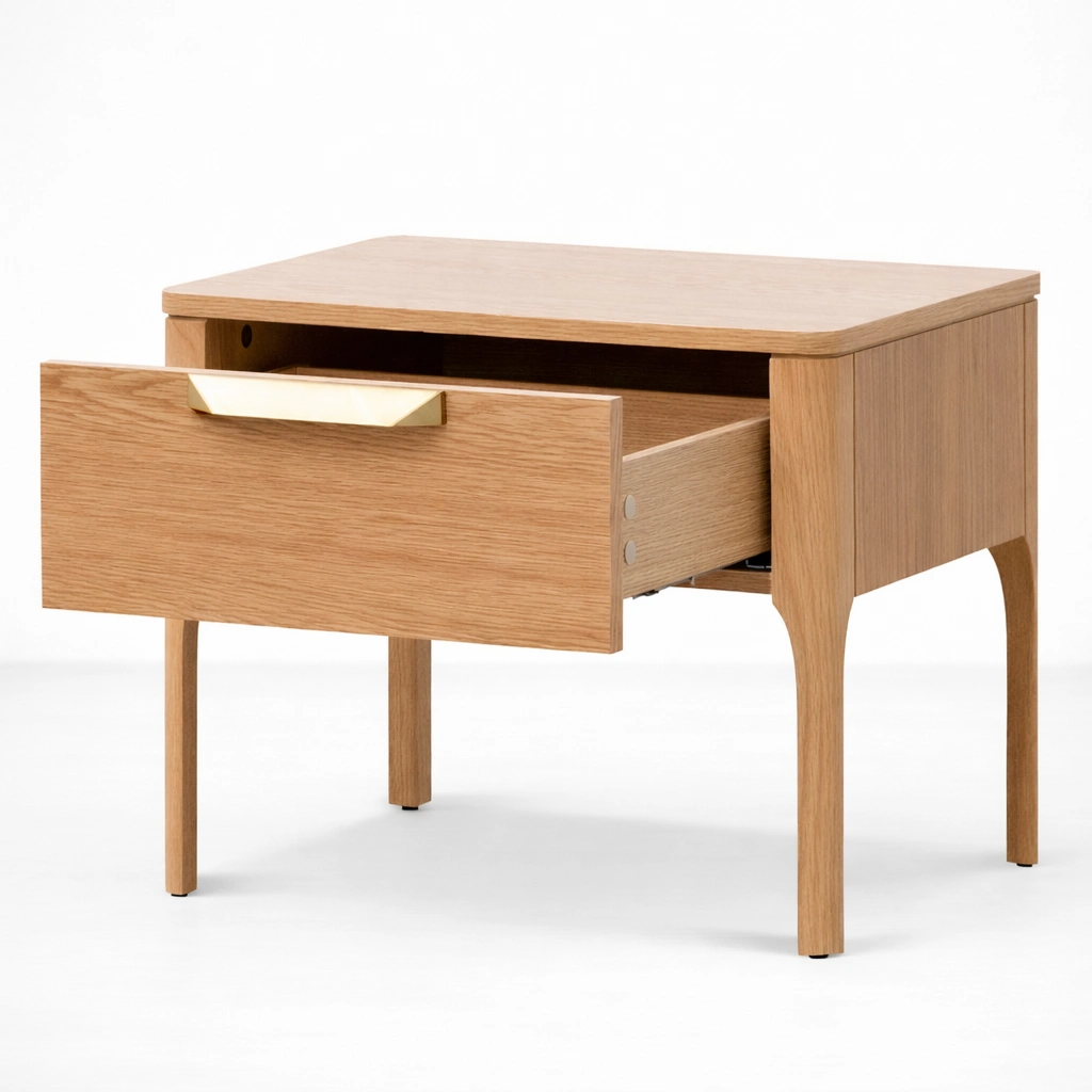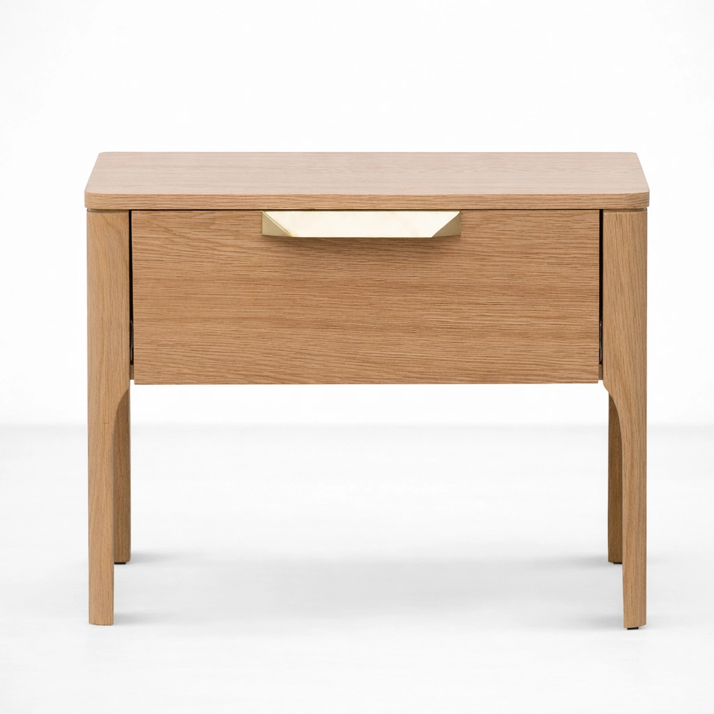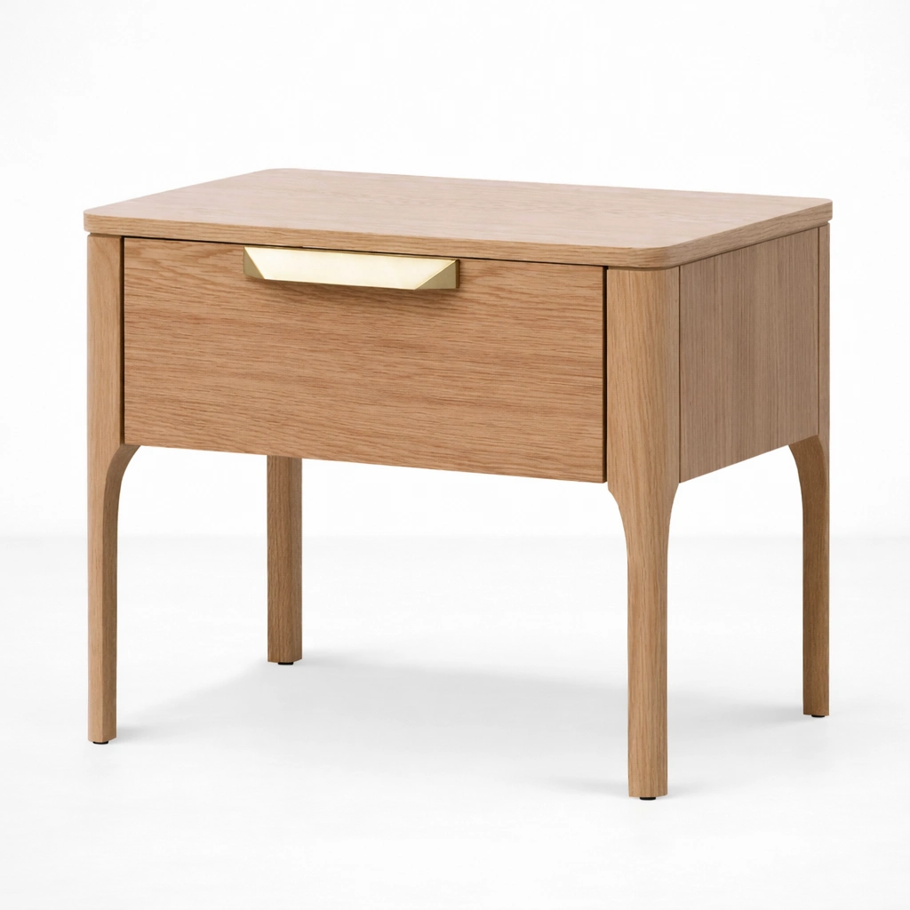 Its design features a neatly proportioned tabletop, one spacious drawer, and a clean silhouette supported by slender legs with subtle shaping. The rounded top corners soften the overall form, while the brass-finish handle adds a refined accent that complements the natural ashwood beautifully. This combination gives the piece a calm and elegant look that suits both modern and timeless interiors.