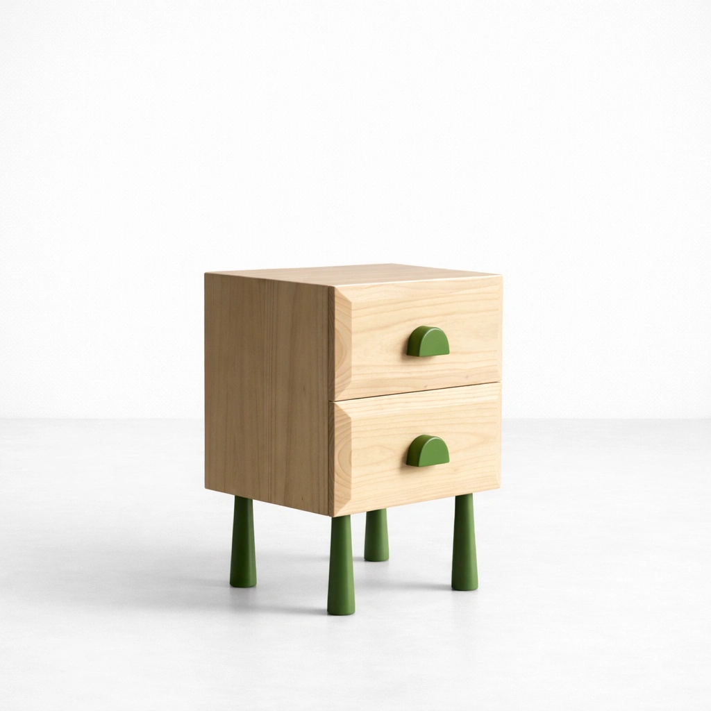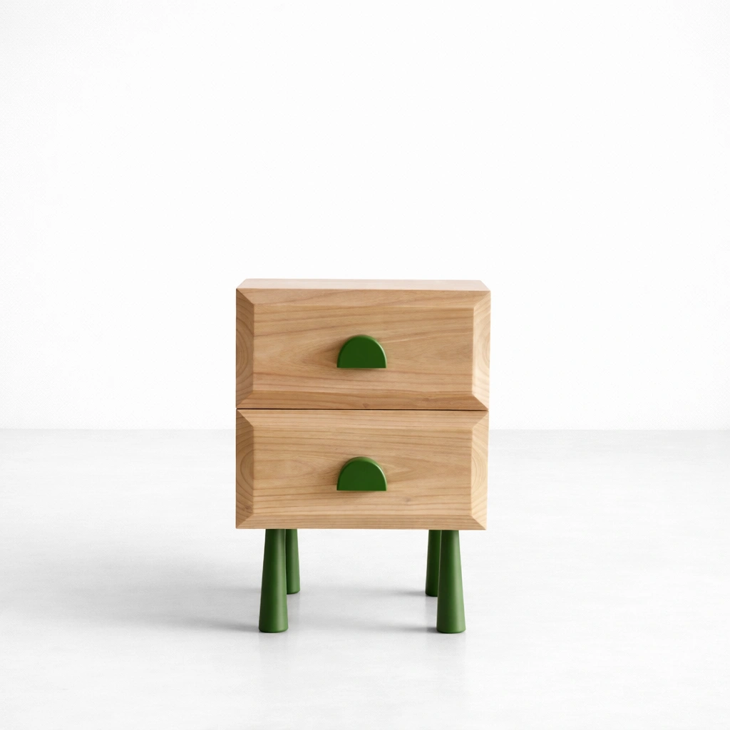 Designed with two drawers, it provides convenient space for daily bedside essentials such as books, chargers, glasses, notepads, and personal accessories. Its simple rectangular body is softened by carefully shaped drawer fronts, while the painted green legs and matching drawer pulls add a subtle touch of character to the overall design.