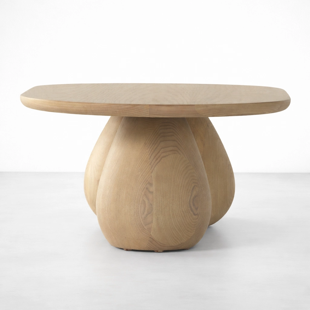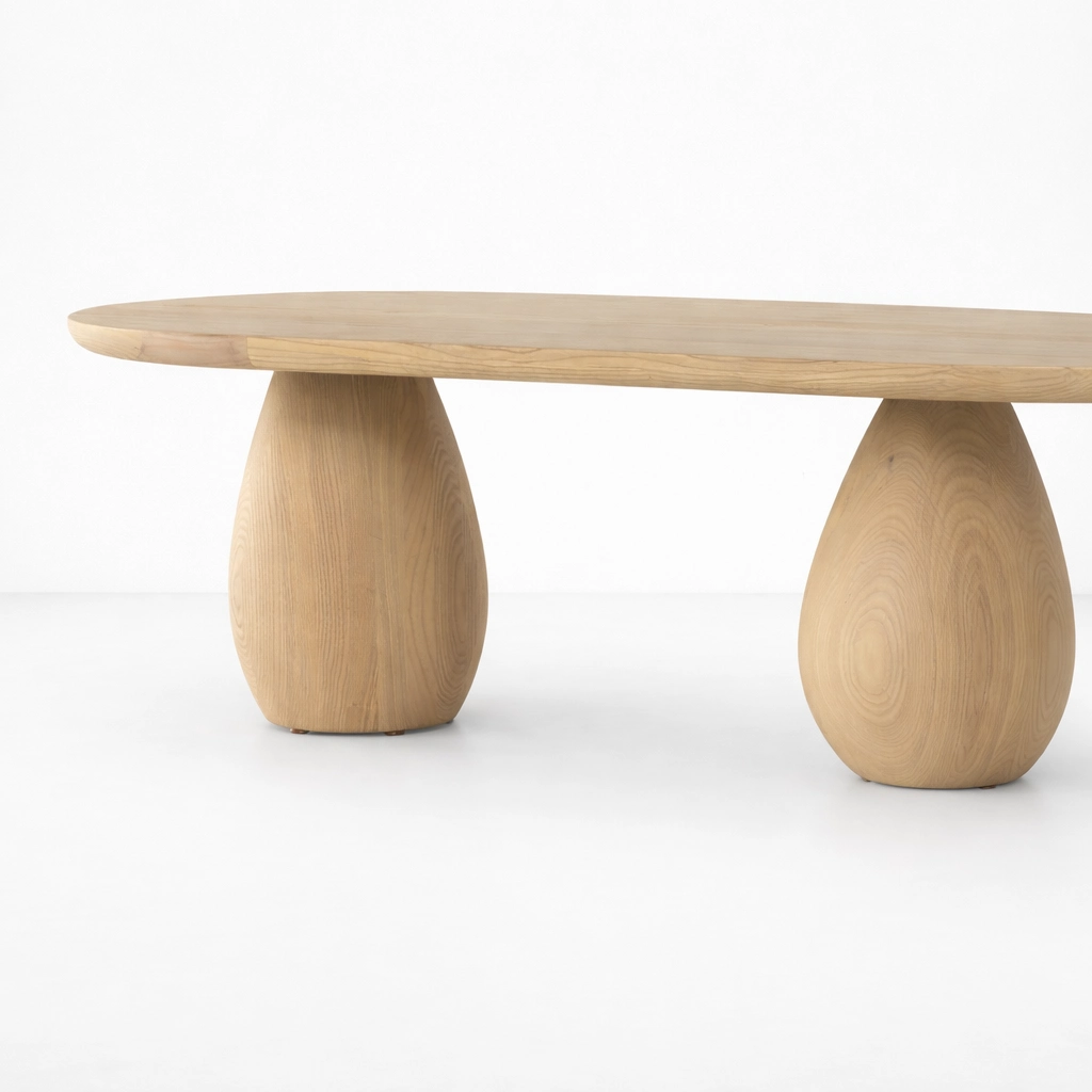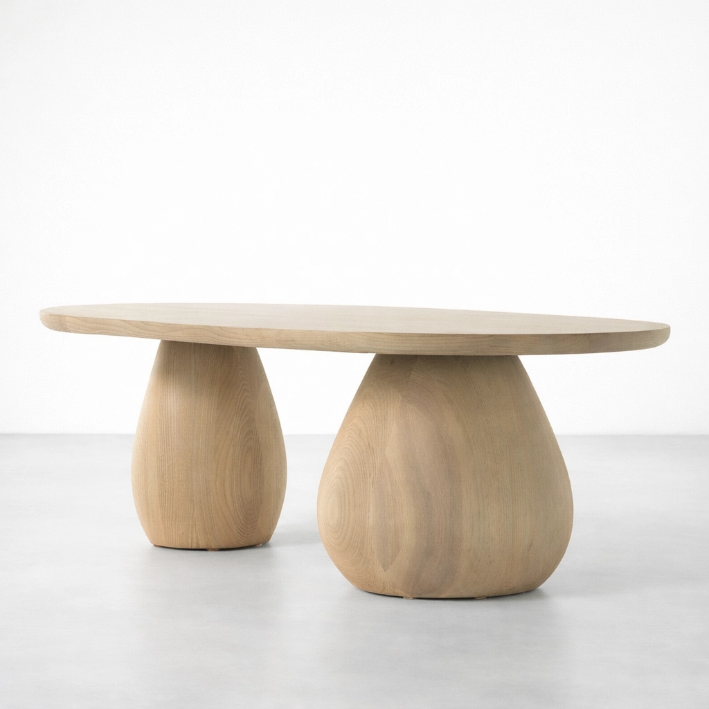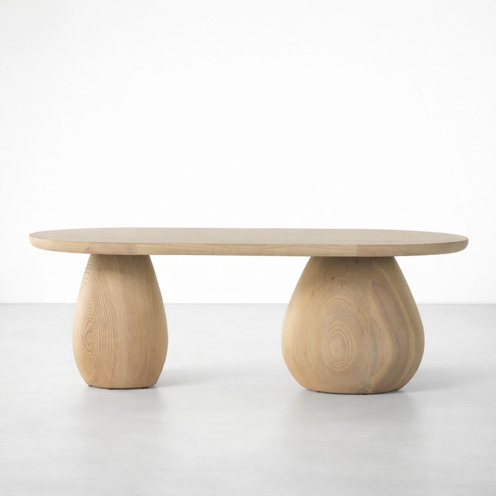Its elongated oval top brings balance and visual softness to the space, while the rounded pedestal forms beneath add depth, character, and a strong architectural presence. The natural ashwood grain gives the table a warm and organic appeal, making it suitable for interiors that value calm design, material richness, and understated sophistication Ashwood oval centre table.