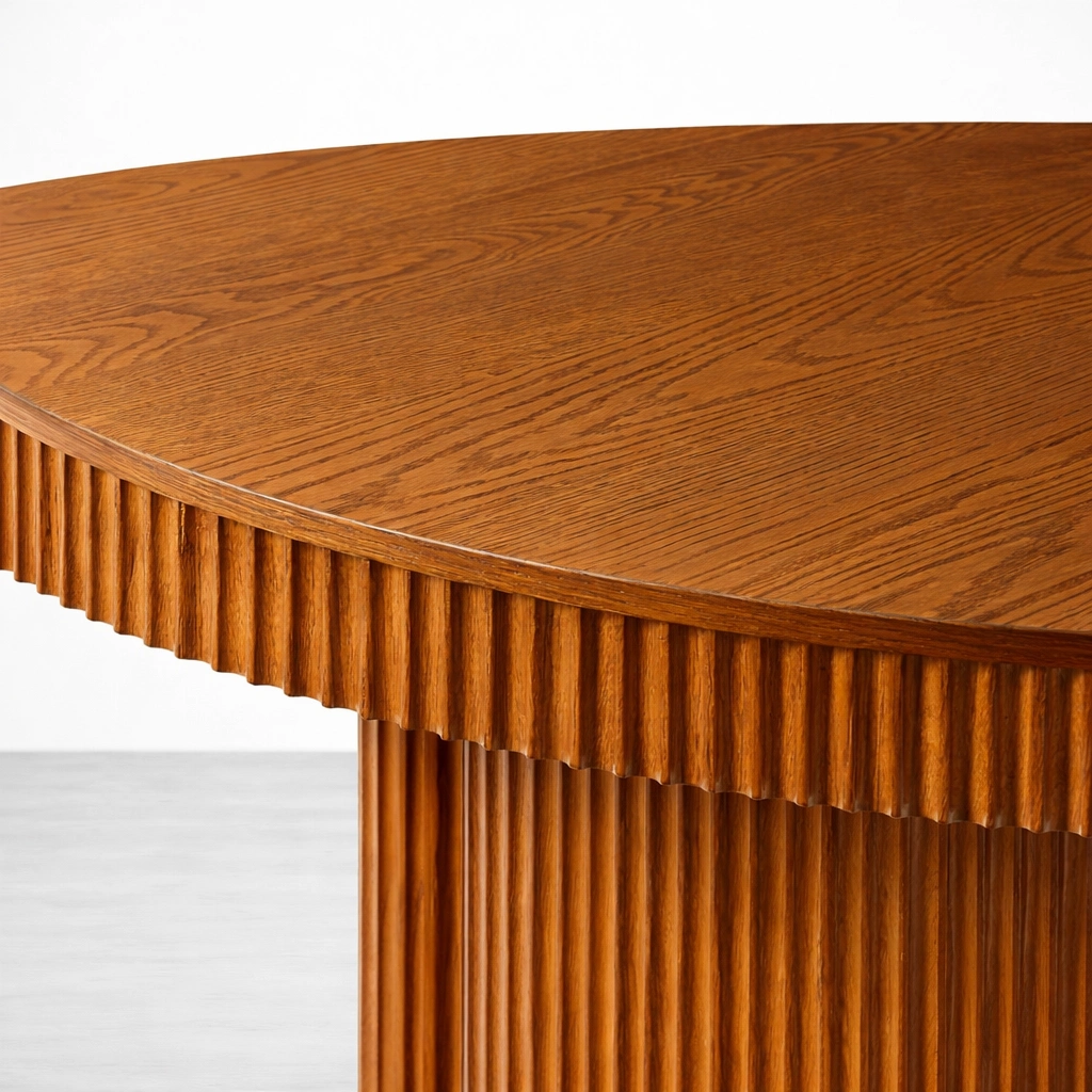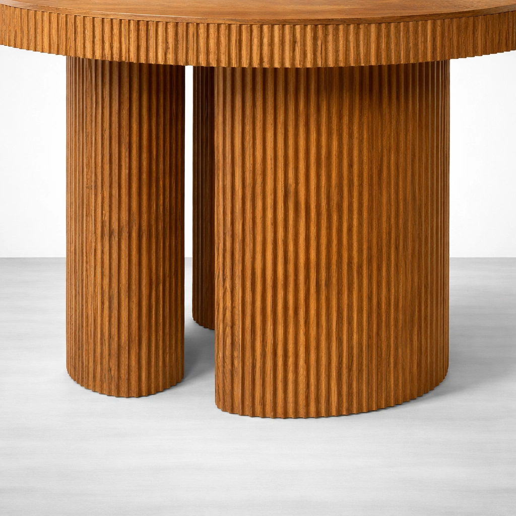 The Aster round fluted teakwood dining table is designed to feel warm, balanced, and quietly premium. The round top keeps conversations easy, while the fluted pedestal-style base adds a refined architectural look without feeling heavy. Each table is made to order by INTERIORZE with careful finishing and clean detailing.