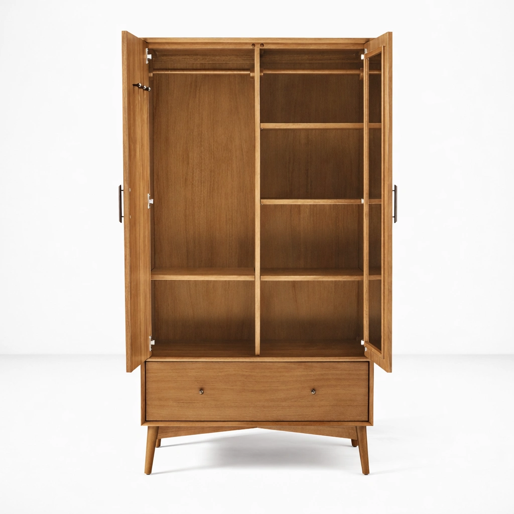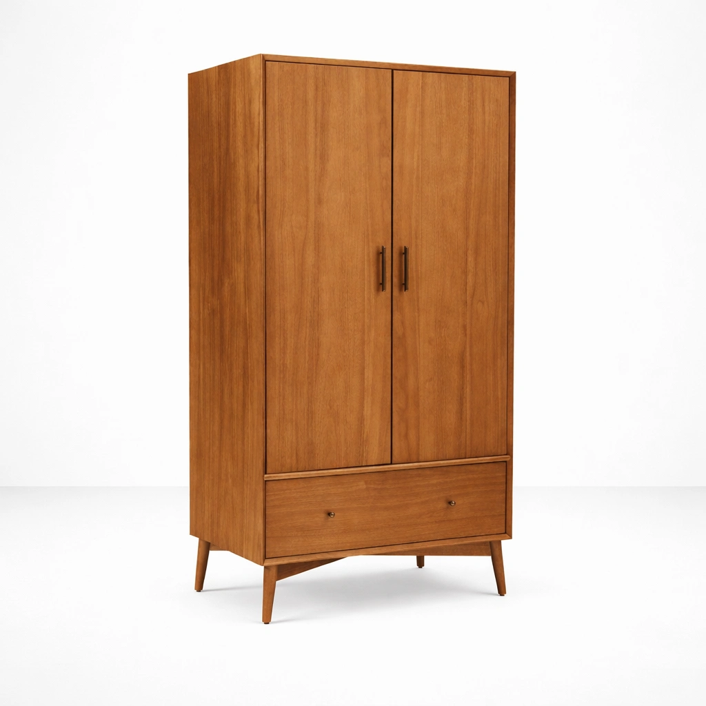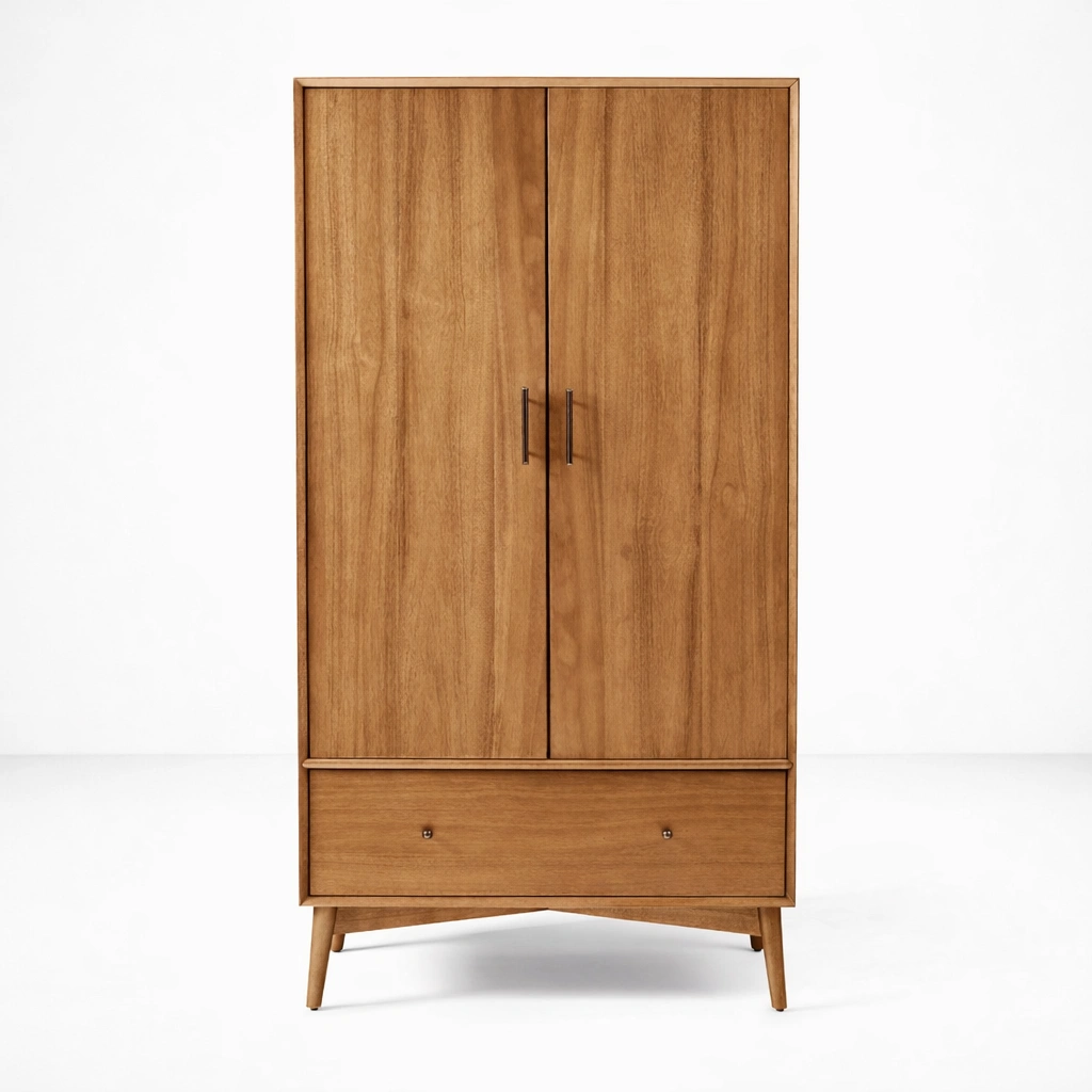 Its wooden doors, slim metal handles, and tapered legs create a furniture style that feels warm, simple, and elegant. The look is minimal, but the detailing gives it enough character to work well in modern, transitional, and natural interior settings. It can be used as a primary bedroom wardrobe, a guest room storage piece, or a compact clothing cabinet for apartments and curated spaces.