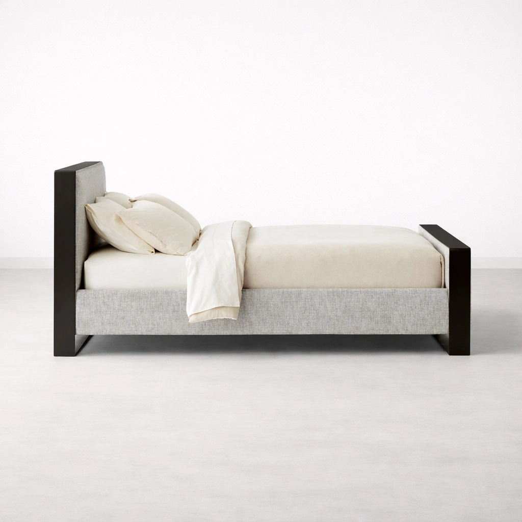 The Aster bed is designed with a minimal silhouette and a refined material combination. The upholstered surfaces add softness and comfort, while the dark frame border and metal base create visual structure. The slightly elevated design helps the bed look lighter in the room and suits modern, contemporary, and premium interiors.