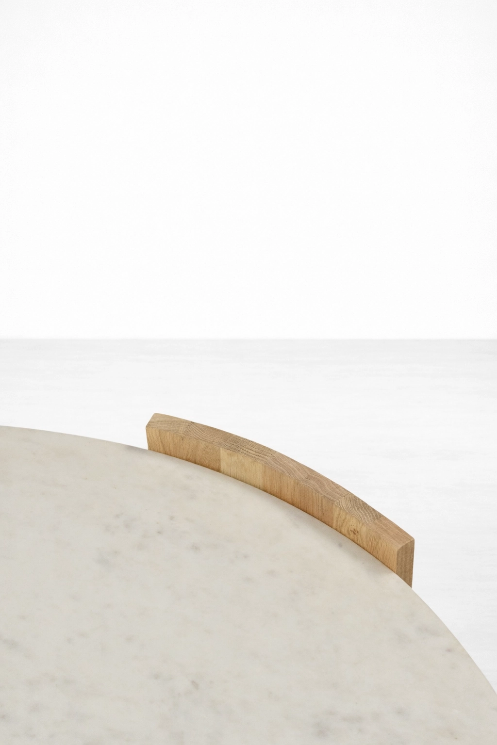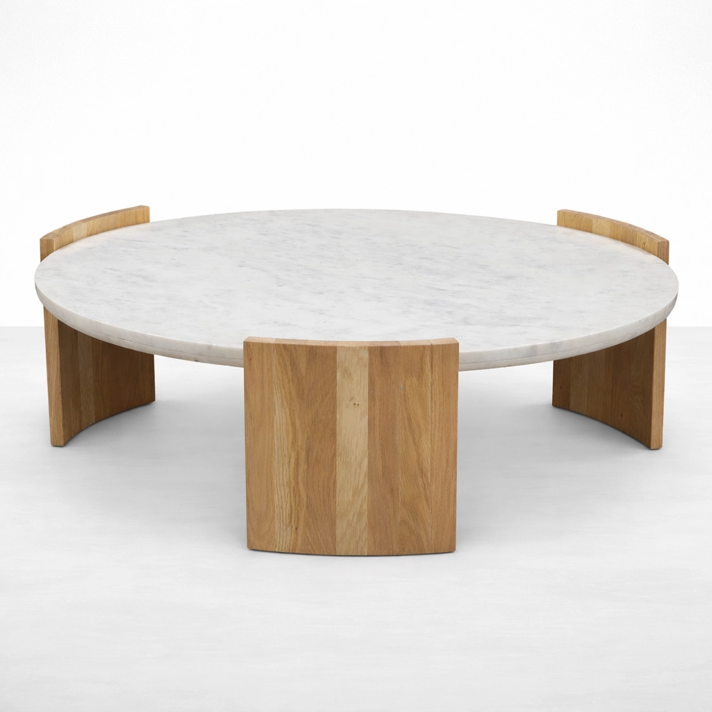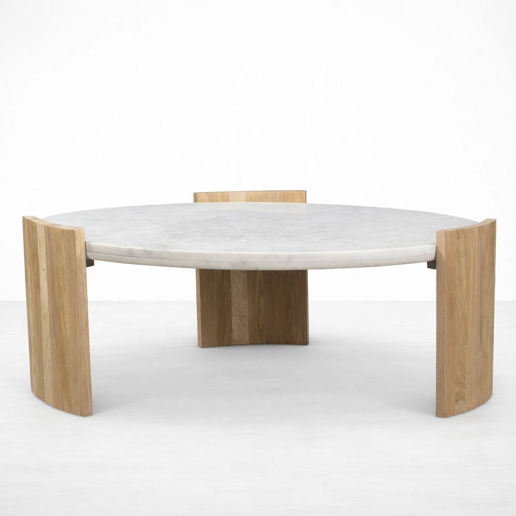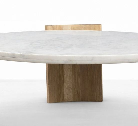 Its generous round shape creates an inviting layout for living rooms, lounges, reception areas, and carefully designed hospitality spaces. The white marble surface adds a clean and elegant presence, while the warm teakwood panels below give the piece a grounded and architectural character. This balance of stone and wood helps the table feel substantial without appearing heavy marble center table.