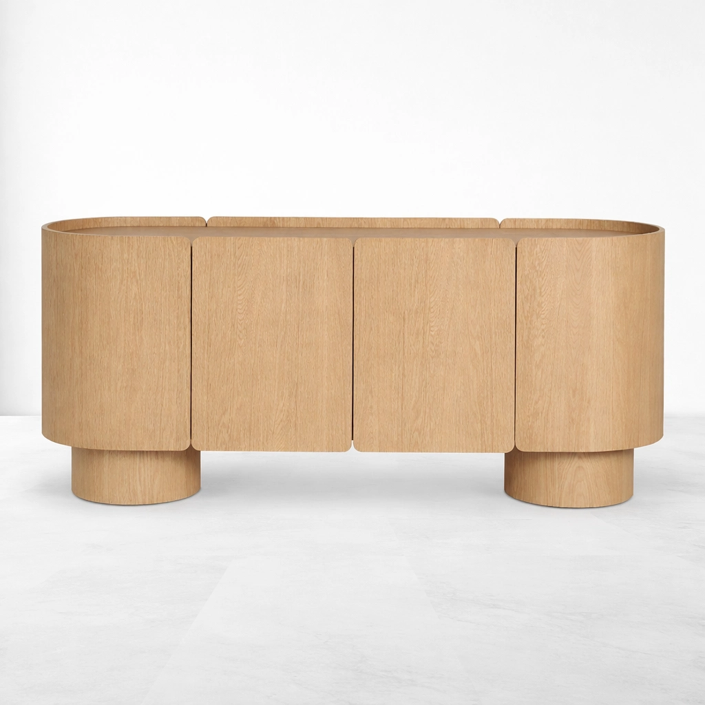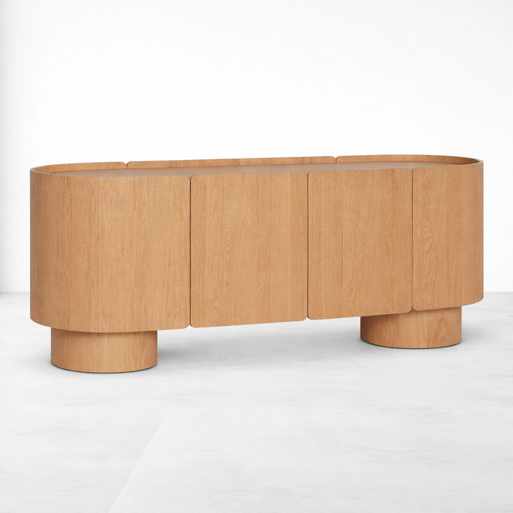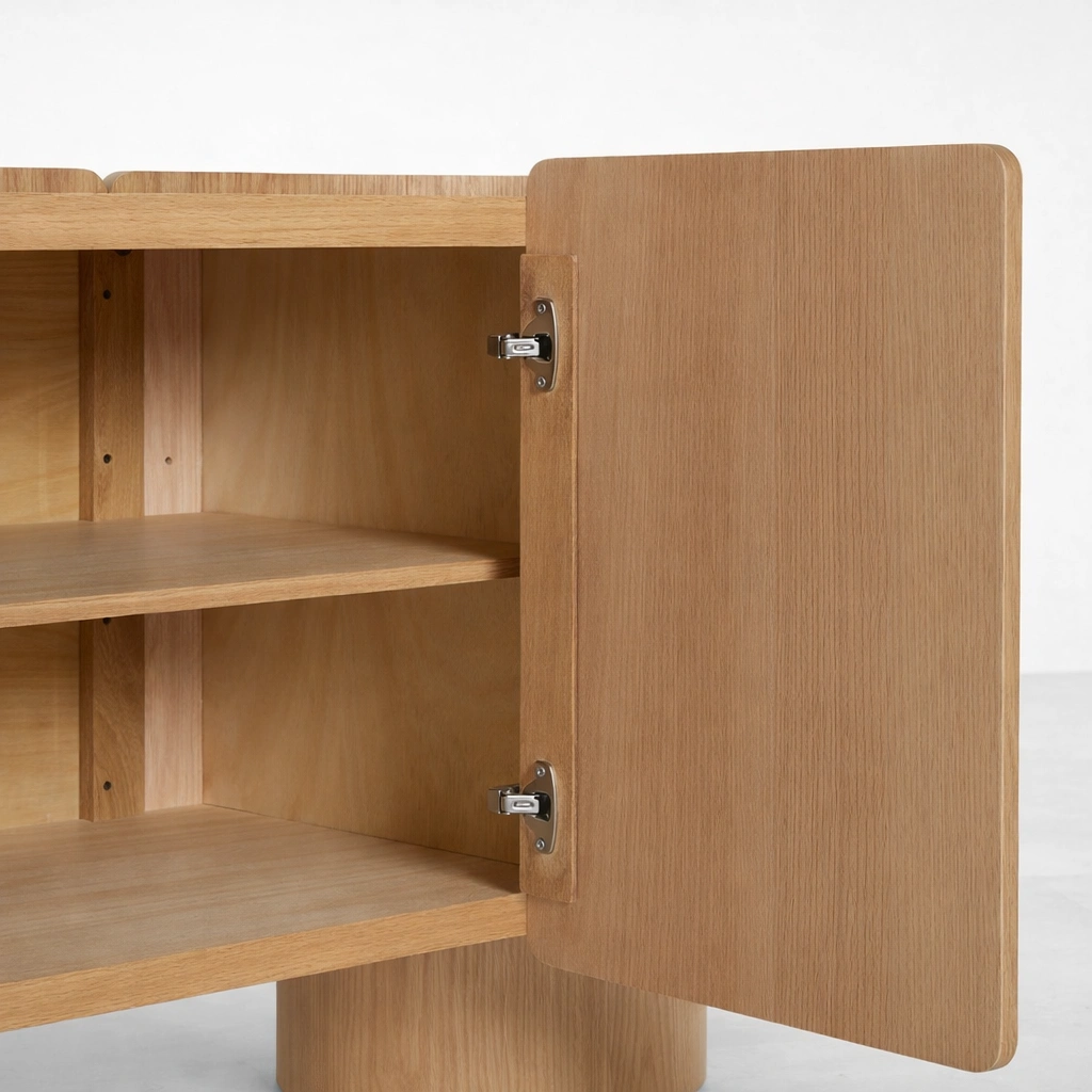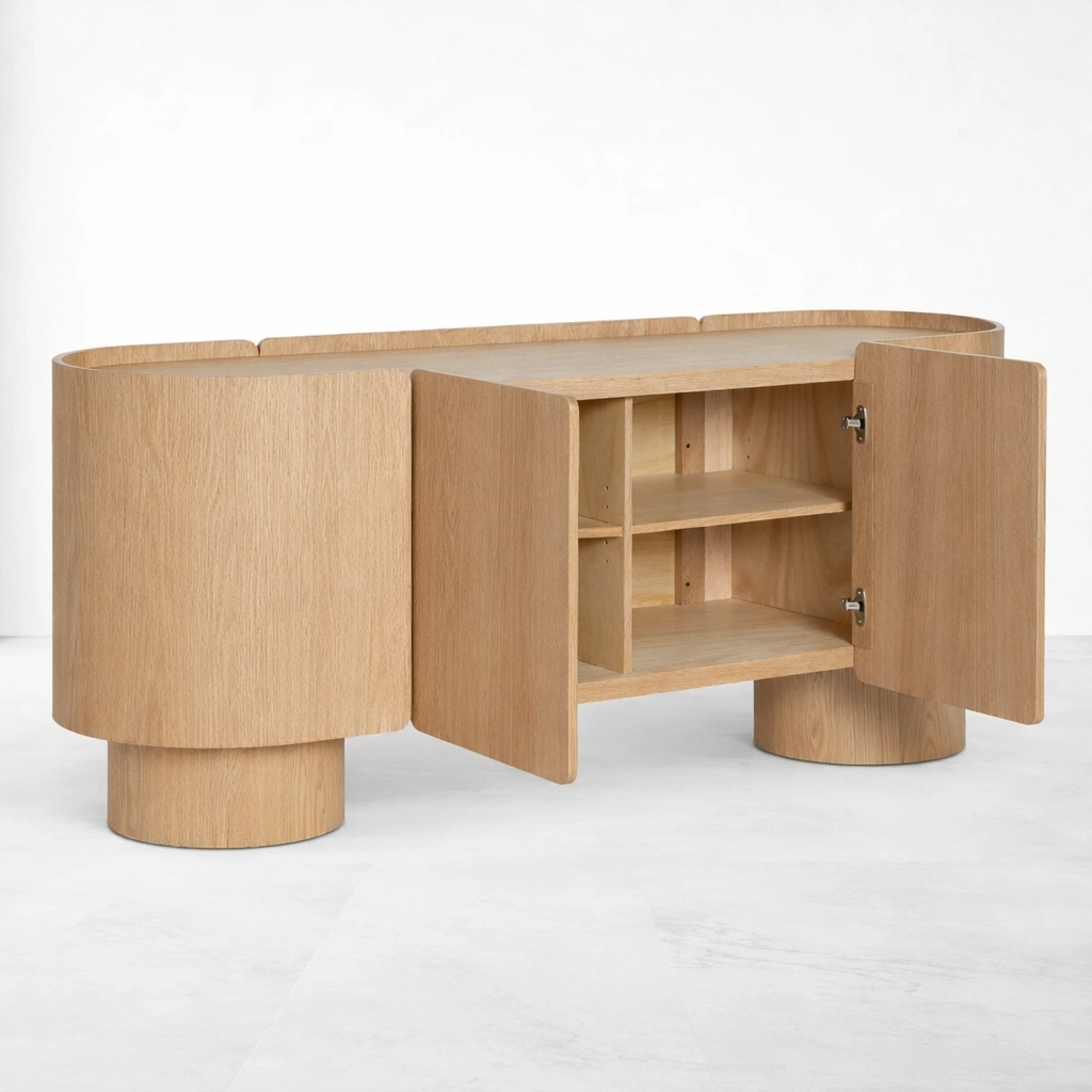 The overall presence of the Aurelle Curve Ash Wood Sideboard is simple, but its rounded silhouette and pedestal-style base give it a distinctive identity. It can work as a sideboard, buffet cabinet, storage console, or statement piece for interiors that value both practicality and refined design.