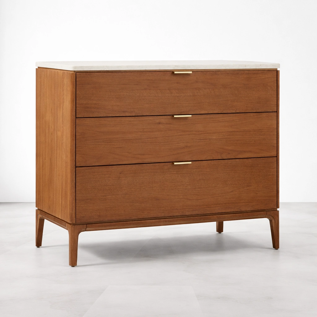The INTERIORZE Aurello Marble Top Teak Wood Chest of Drawers is thoughtfully designed for interiors that appreciate clean lines, warm wood tones, and practical storage with a refined visual presence. Made in teak wood, this chest of drawers features a calm horizontal form, three generously sized drawers, softly rounded edges, and a marble top that adds contrast, sophistication, and everyday usability.