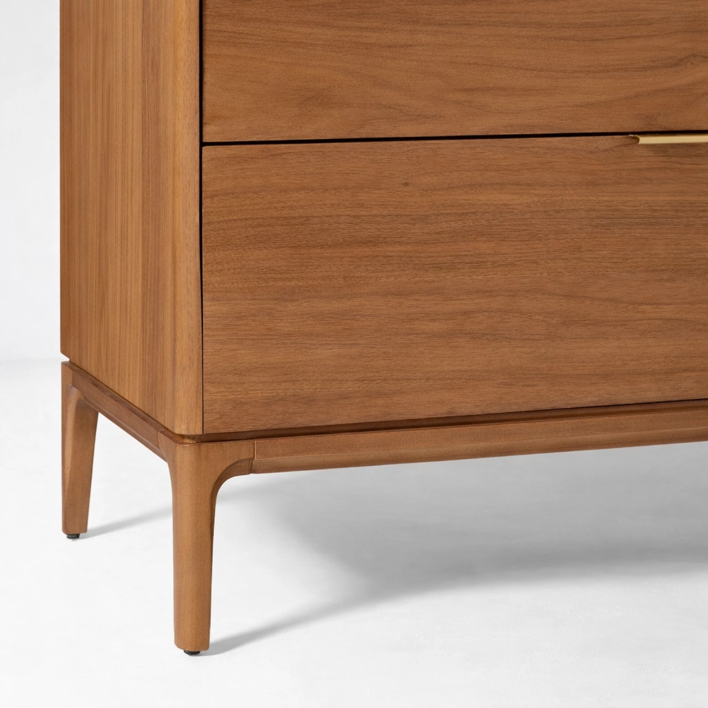 • side detail of INTERIORZE teak wood chest of drawers with slim leg frame and warm walnut finish