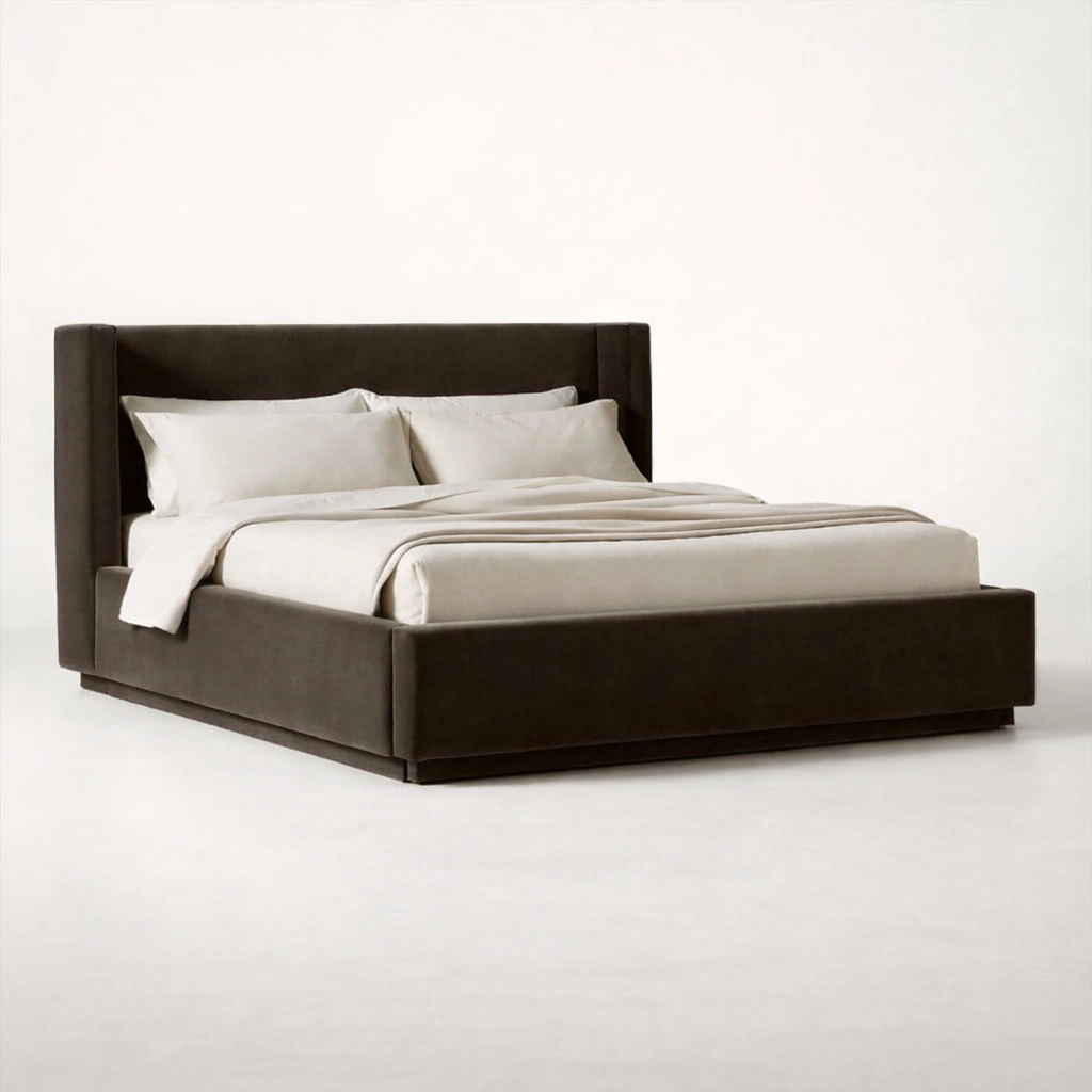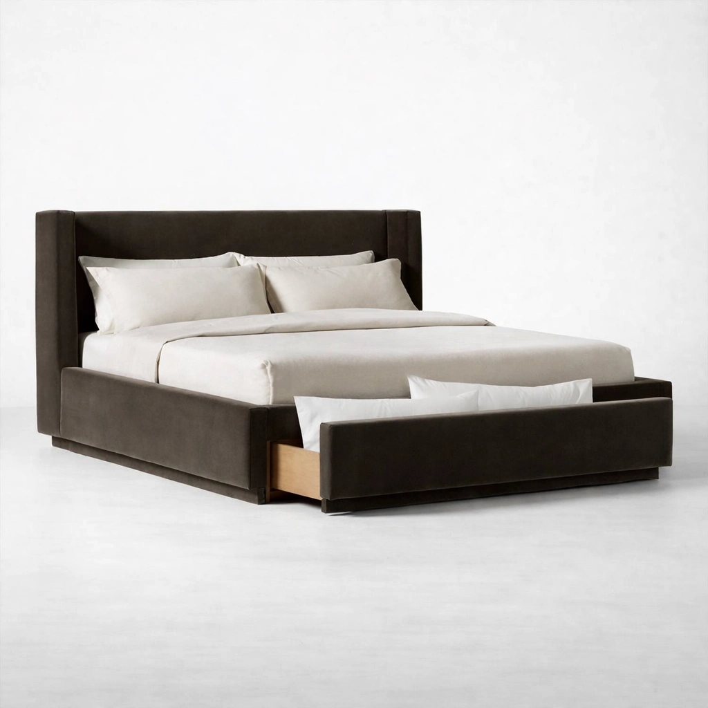 This teakwood upholstered storage bed combines a modern upholstered profile with practical storage. The tall headboard creates a premium look, while the footboard drawer adds useful hidden storage without making the design look bulky. The dark upholstered finish pairs well with neutral bedding and warm interiors.