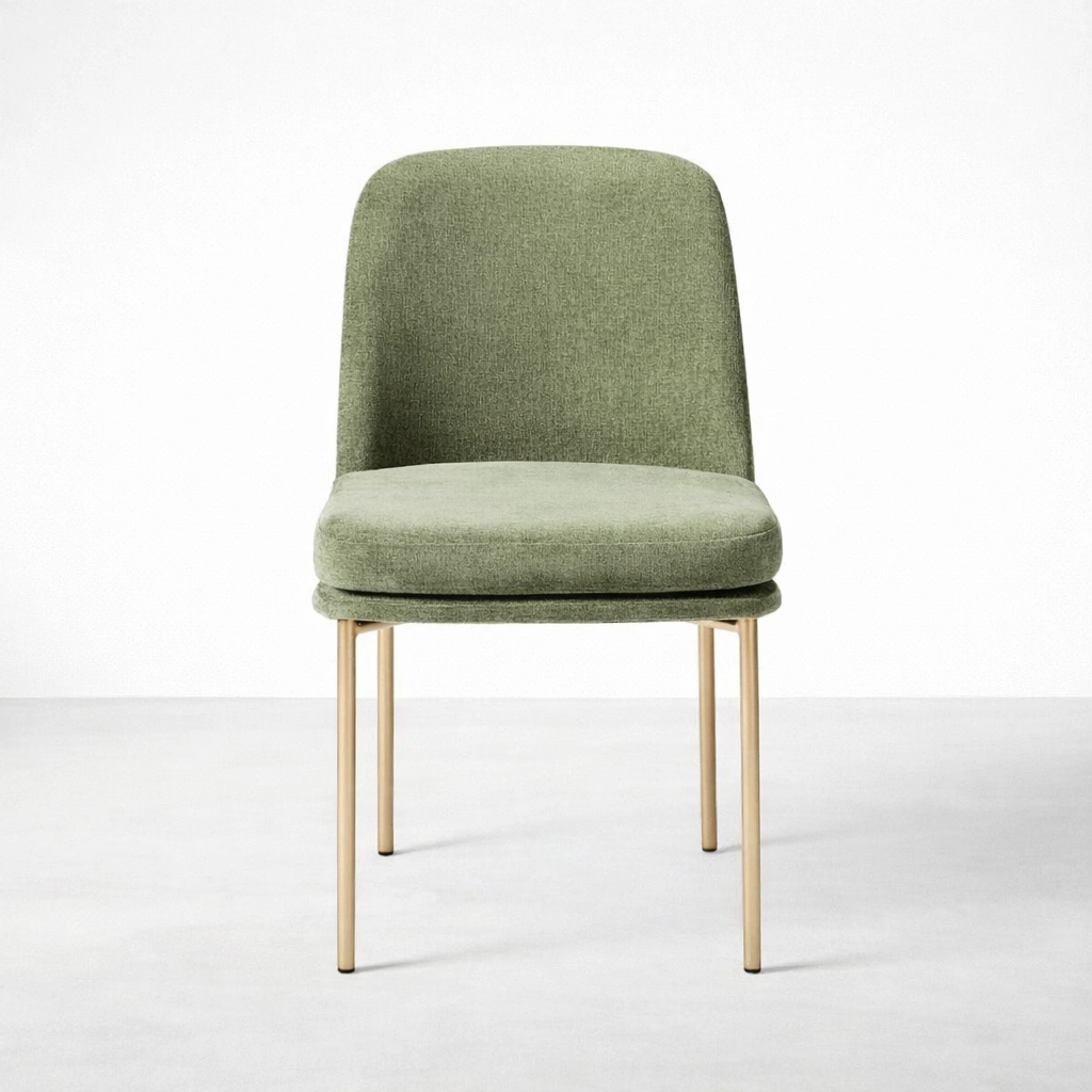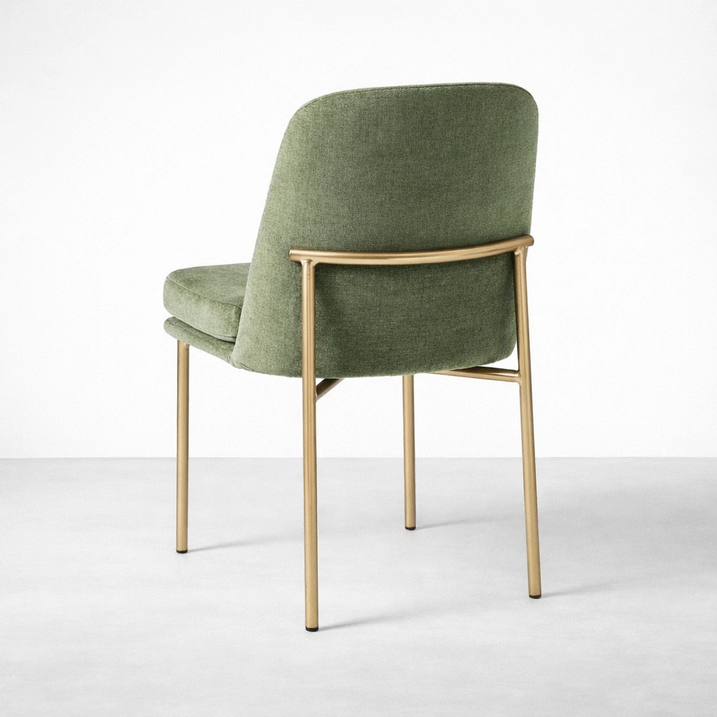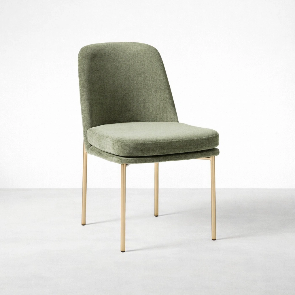 The INTERIORZE Aurora sage green upholstered dining chair is made for comfortable seating and a calm, balanced aesthetic. The gently curved backrest supports relaxed posture, while the cushioned seat feels welcoming for everyday meals and longer conversations. A sleek gold-finish metal frame completes the look with a refined, modern touch.