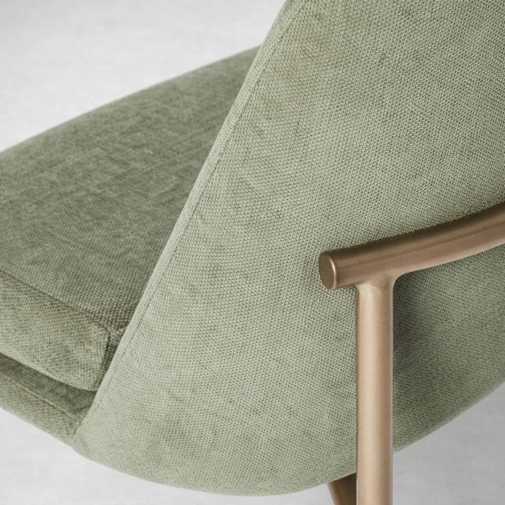 This chair is upholstered in a durable fabric with a soft texture that suits both homes and commercial interiors. The metal structure is designed for stability and clean lines, making it easy to match with marble, wood, glass, or metal dining tables.