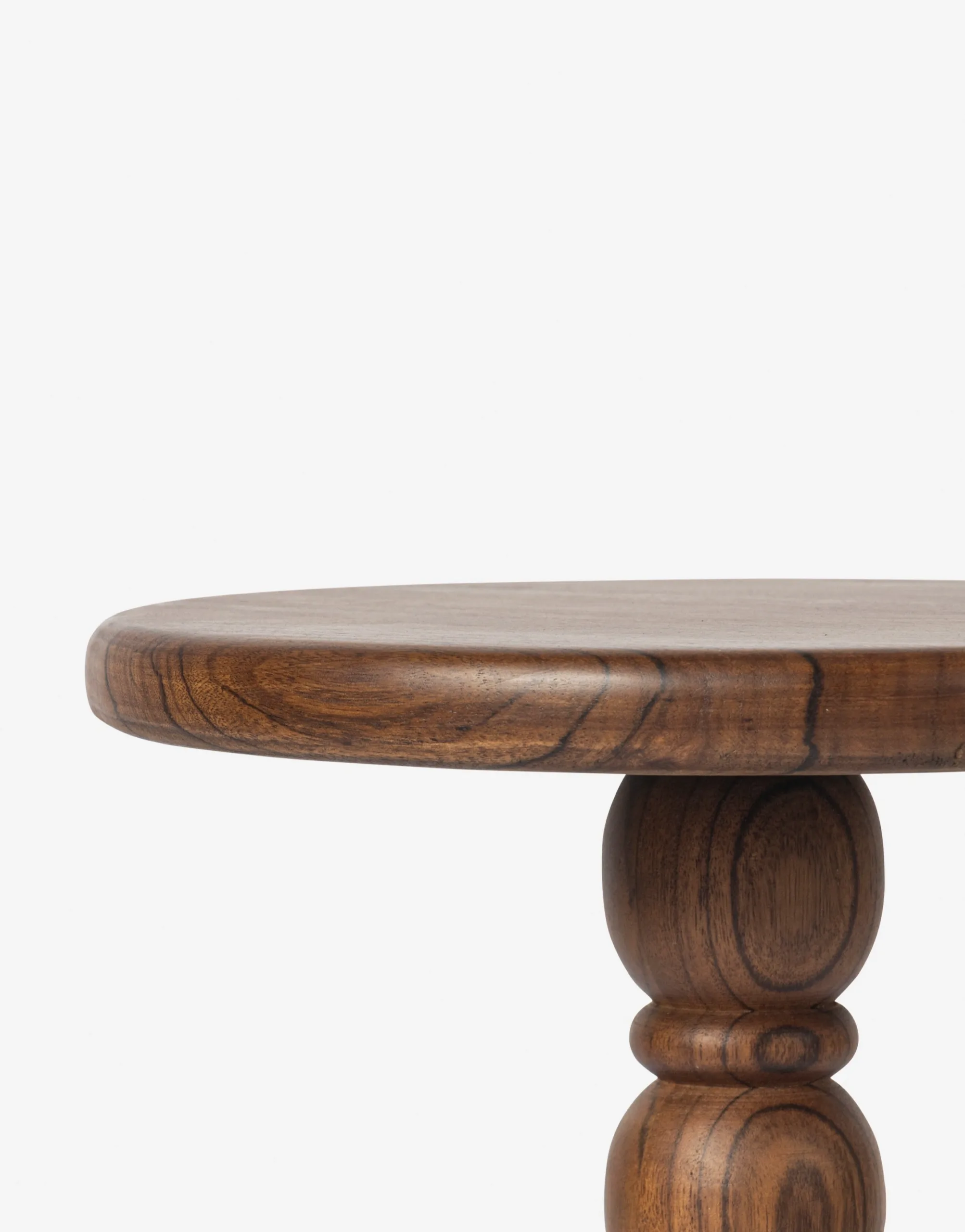 Its teak wood construction highlights the natural grain, tonal richness, and enduring beauty of the material, giving the piece a warm and grounded presence. The turned central support adds visual rhythm and handcrafted character, while the balanced round top keeps the silhouette practical and easy to style. The base provides stability and completes the design with a soft sculptural profile that feels both classic and contemporary.