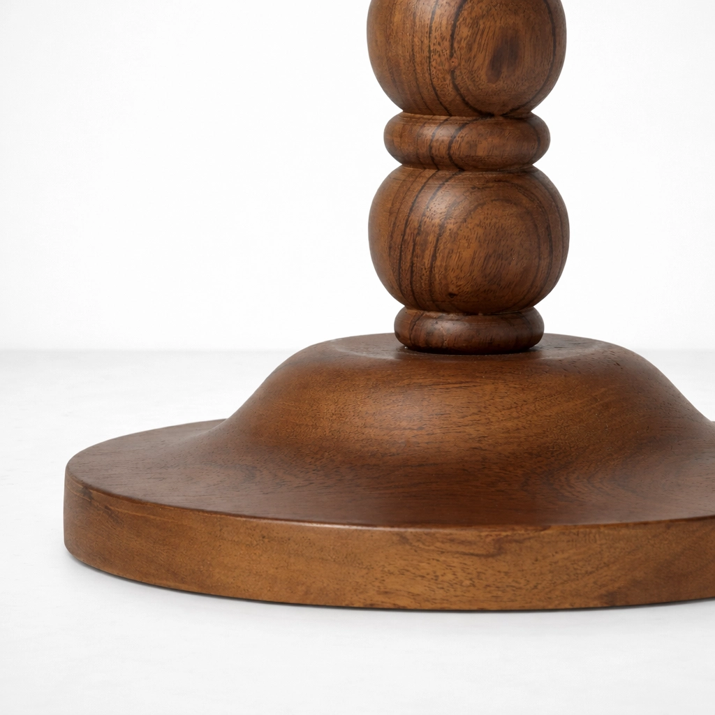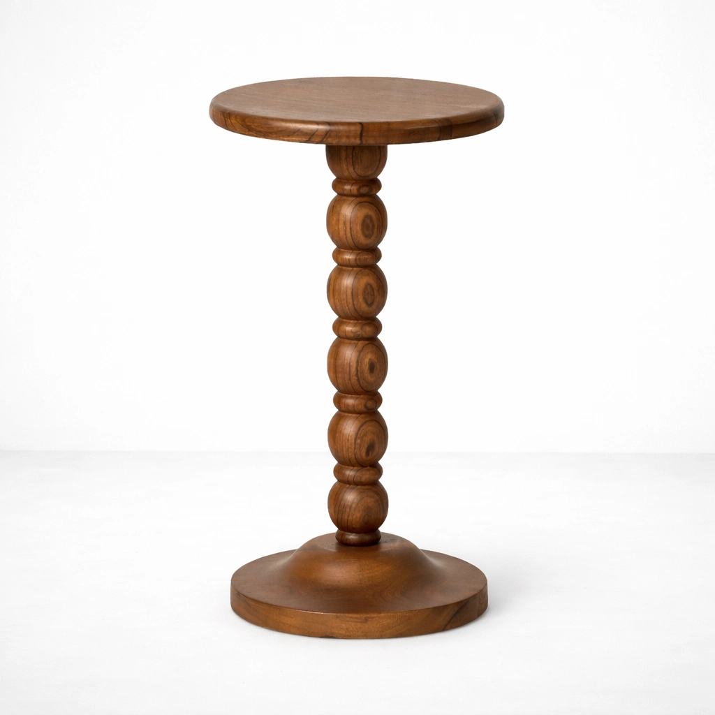 The INTERIORZE Beaded Spindle Teak Wood Side Table is a thoughtfully crafted piece designed for interiors that appreciate sculptural detail, natural warmth, and timeless form. Made in teak wood, this side table features a refined round top paired with a turned spindle-style pedestal made of rounded beaded forms, all resting on a softly contoured circular base. The overall design feels elegant, distinctive, and quietly expressive.