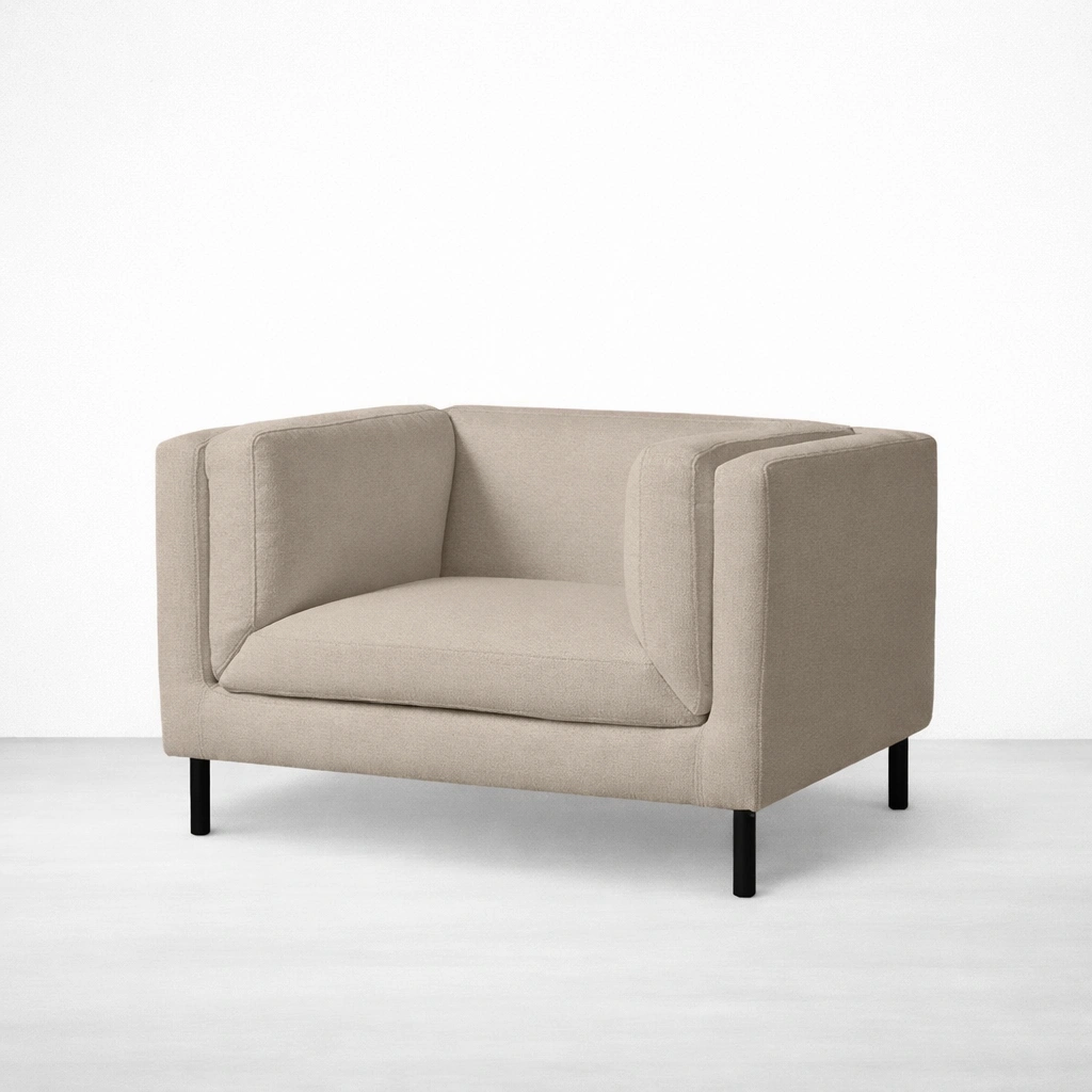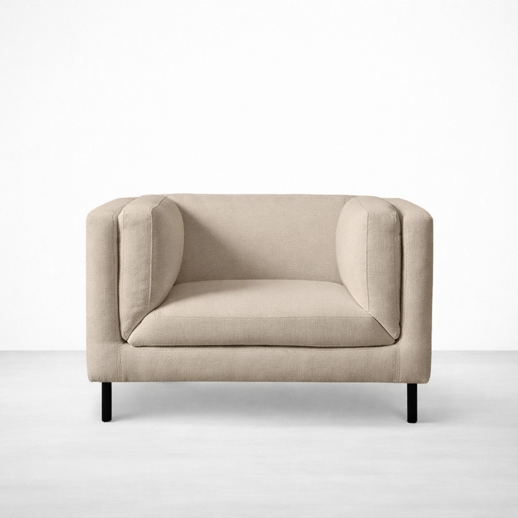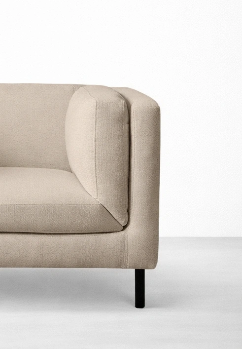 DUNE from INTERIORZE is a beige accent chair with teakwood legs made for calm, modern spaces. The silhouette is clean and compact, and the supportive inner cushions create a comfortable sitting posture without adding visual bulk. The slim legs lift the chair slightly, helping the room feel more open, which can be useful in smaller living rooms and apartments beige accent chair with teakwood legs.