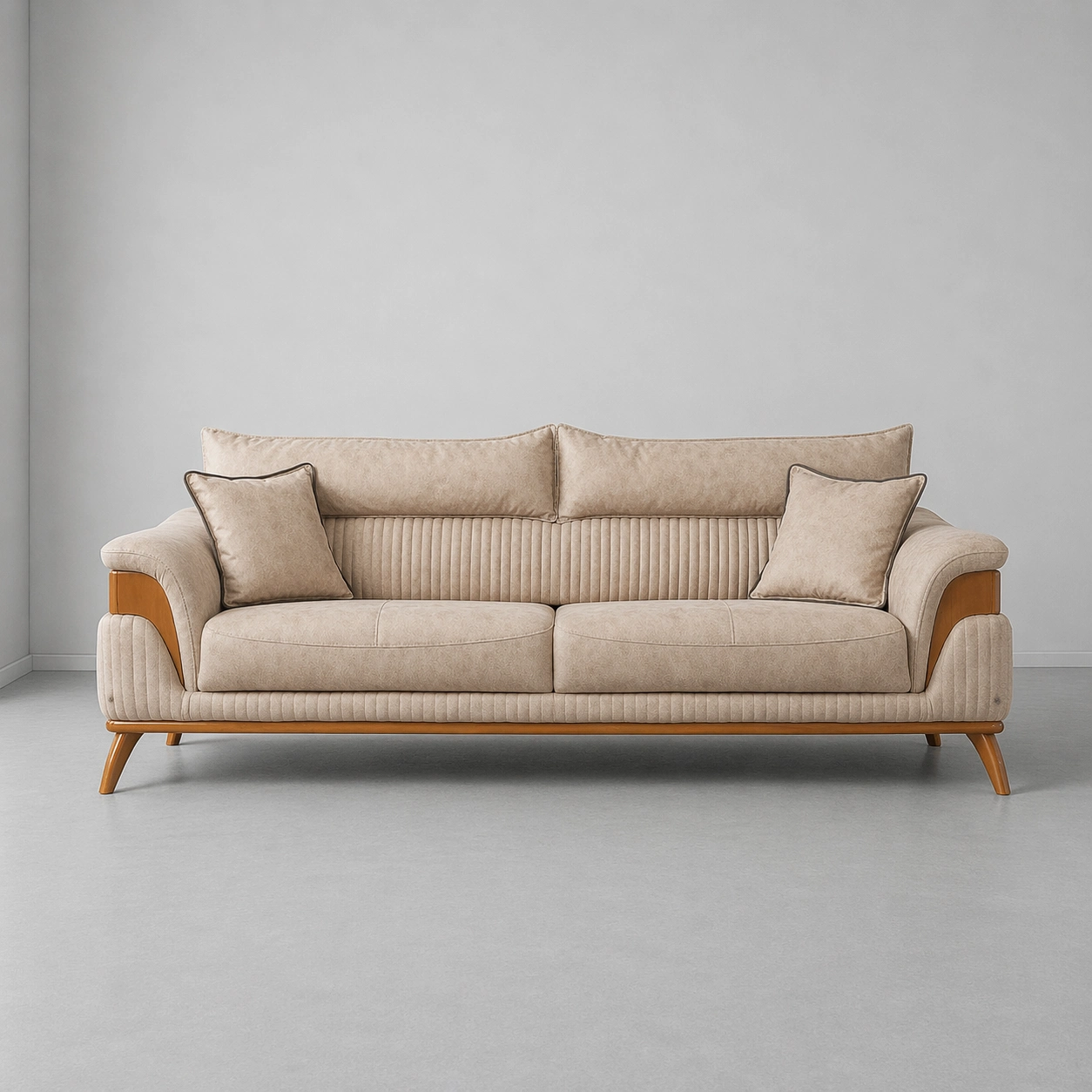 The INTERIORZE ELITE beige fabric sofa is a premium modern sofa designed for elegant homes, lounges, offices, hotels, and luxury living spaces. It features soft beige upholstery, wide cushioned seating, comfortable back cushions, curved padded armrests, vertical channel tufting, wooden side accents, wooden base detailing, tapered wooden legs, and matching pillows beige fabric sofa.