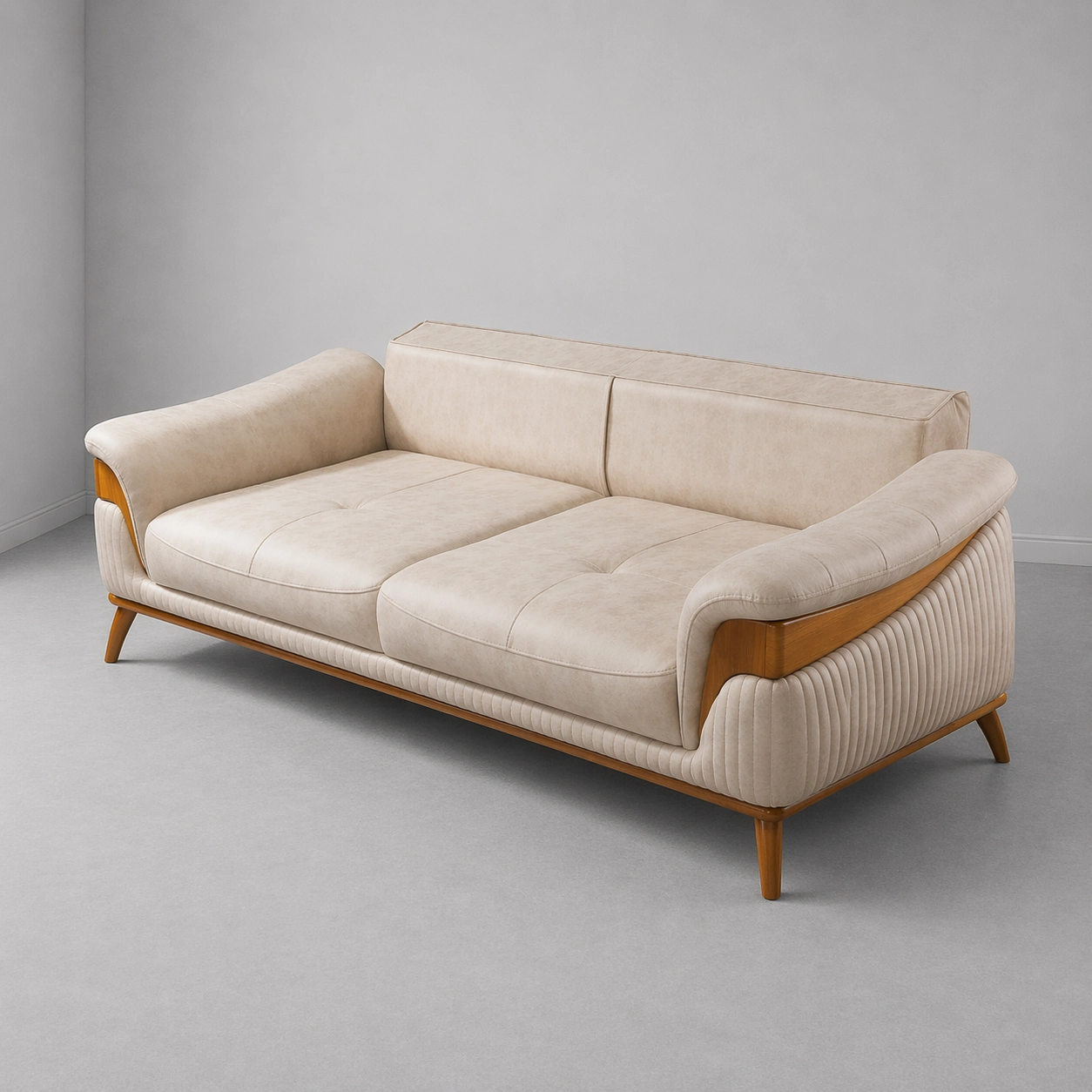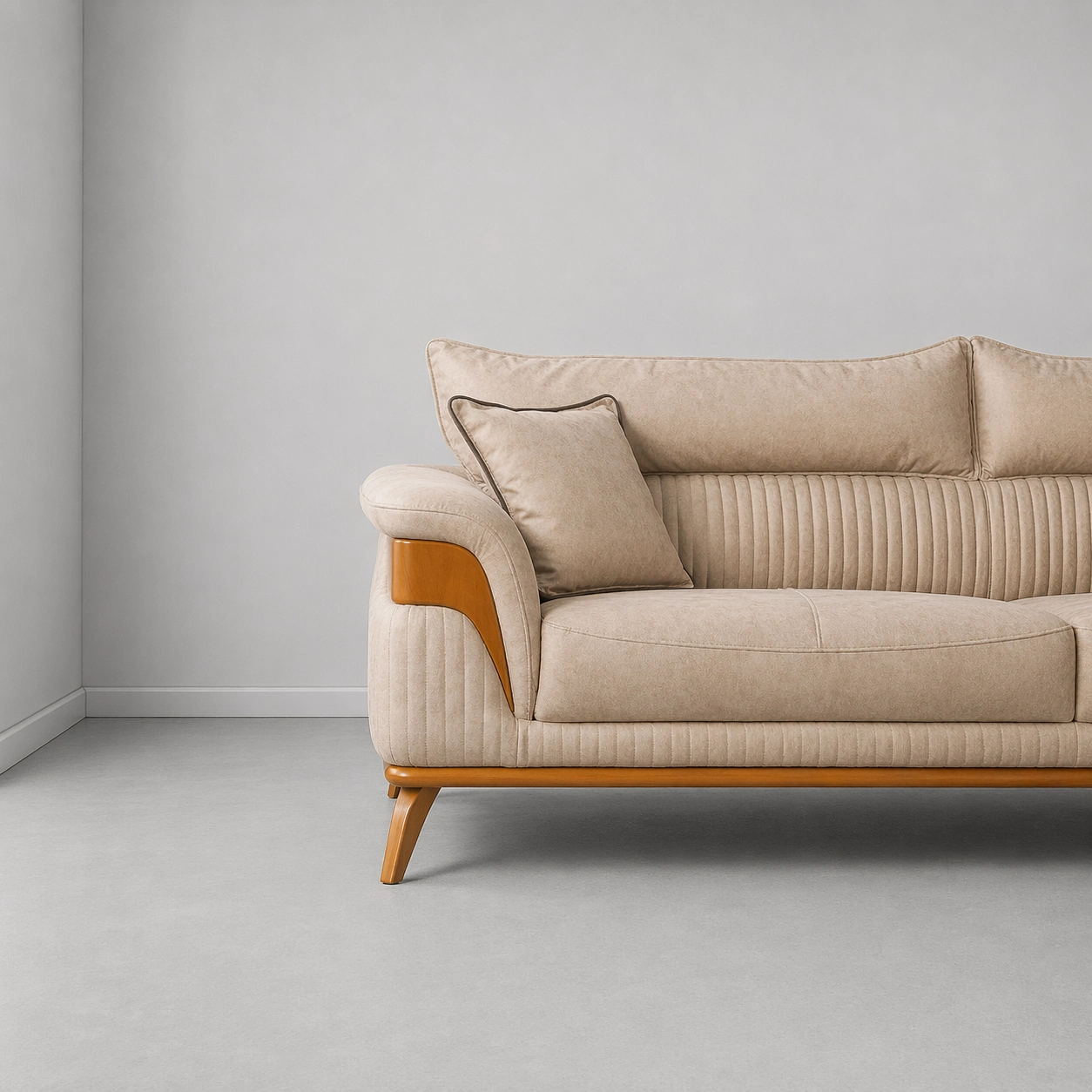 This sofa has a warm and classy look that easily fits modern, contemporary, and premium interiors. The beige fabric gives a soft luxury feel, while the wooden arm panels and wooden legs add a natural designer touch. The vertical tufting on the front and side panels makes the sofa look stylish, detailed, and elegant beige fabric sofa.