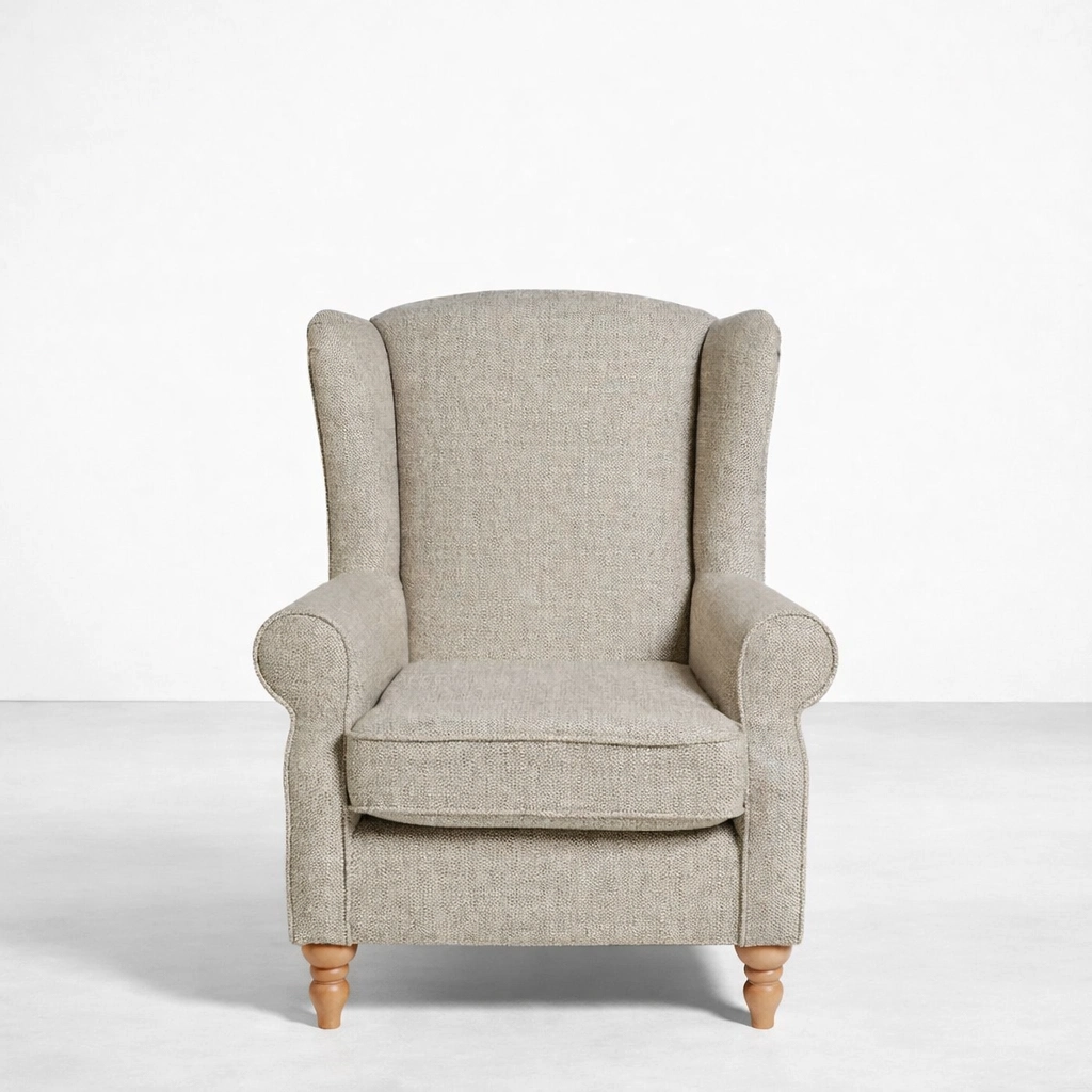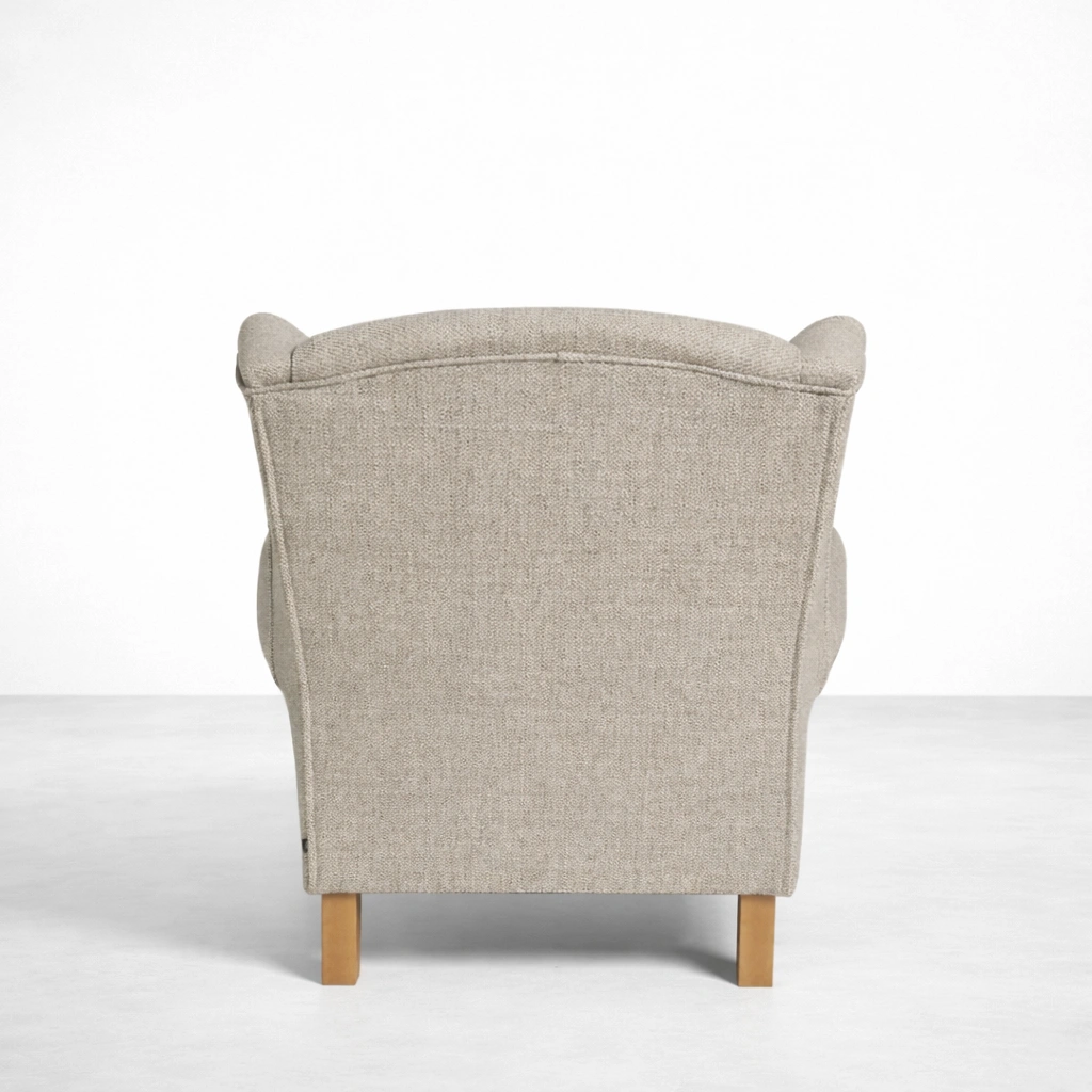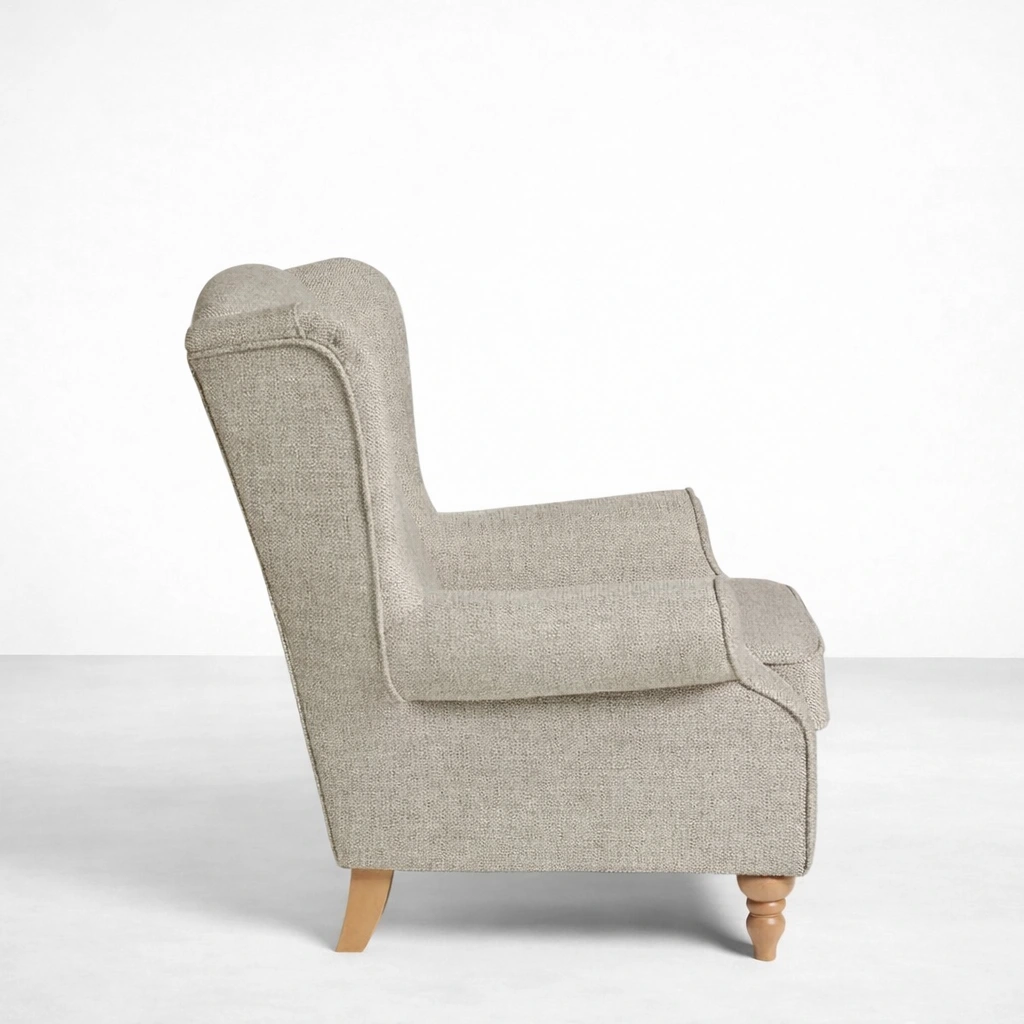 HERITAGEWING from INTERIORZE is a beige wingback armchair with teakwood legs designed for spaces that feel warm, quiet, and timeless. The high back with a subtle wing shape supports your posture, while the deep seat and soft cushioning make it easy to settle in for longer conversations or a slow reading session. The neutral beige upholstery blends with most palettes and lets your rugs, art, and lighting lead the mood of the room beige wingback armchair with teakwood legs.