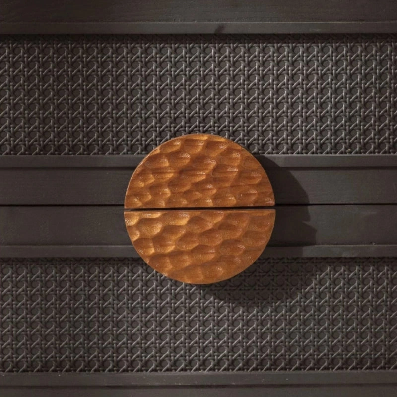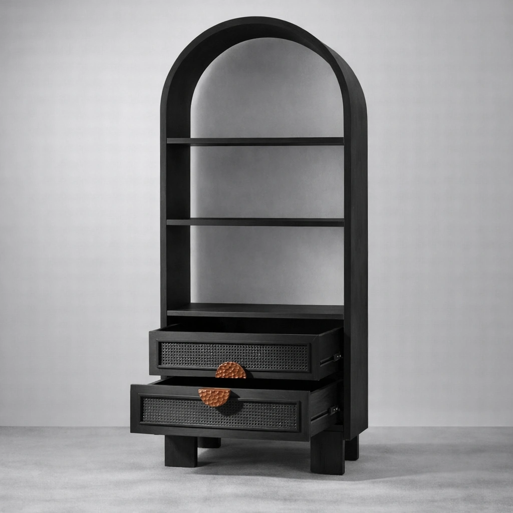 The form of the Arco Cane Black Wood Showcase Cabinet is simple, but its tall arched top, clean shelves, woven cane drawer fronts, and hammered round wooden drawer pull create a distinctive identity. The cabinet works beautifully as a display unit, decorative showcase, bookshelf, or accent storage piece for interiors that value utility with understated character.