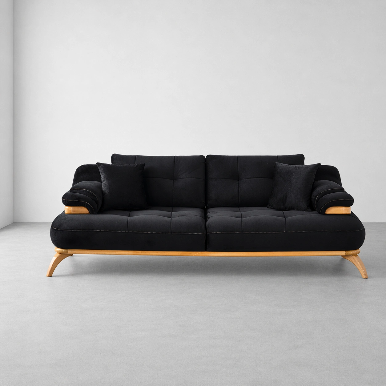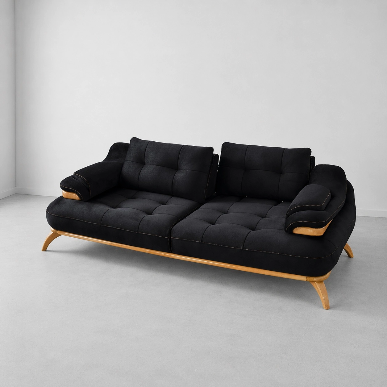 This sofa has a bold and elegant look that gives any room a premium modern feel. The black fabric upholstery creates a rich luxury appearance, while the wooden base and wooden side highlights add warmth and designer detailing. The wide seat design makes it comfortable for daily sitting, relaxing, and lounging black fabric sofa.