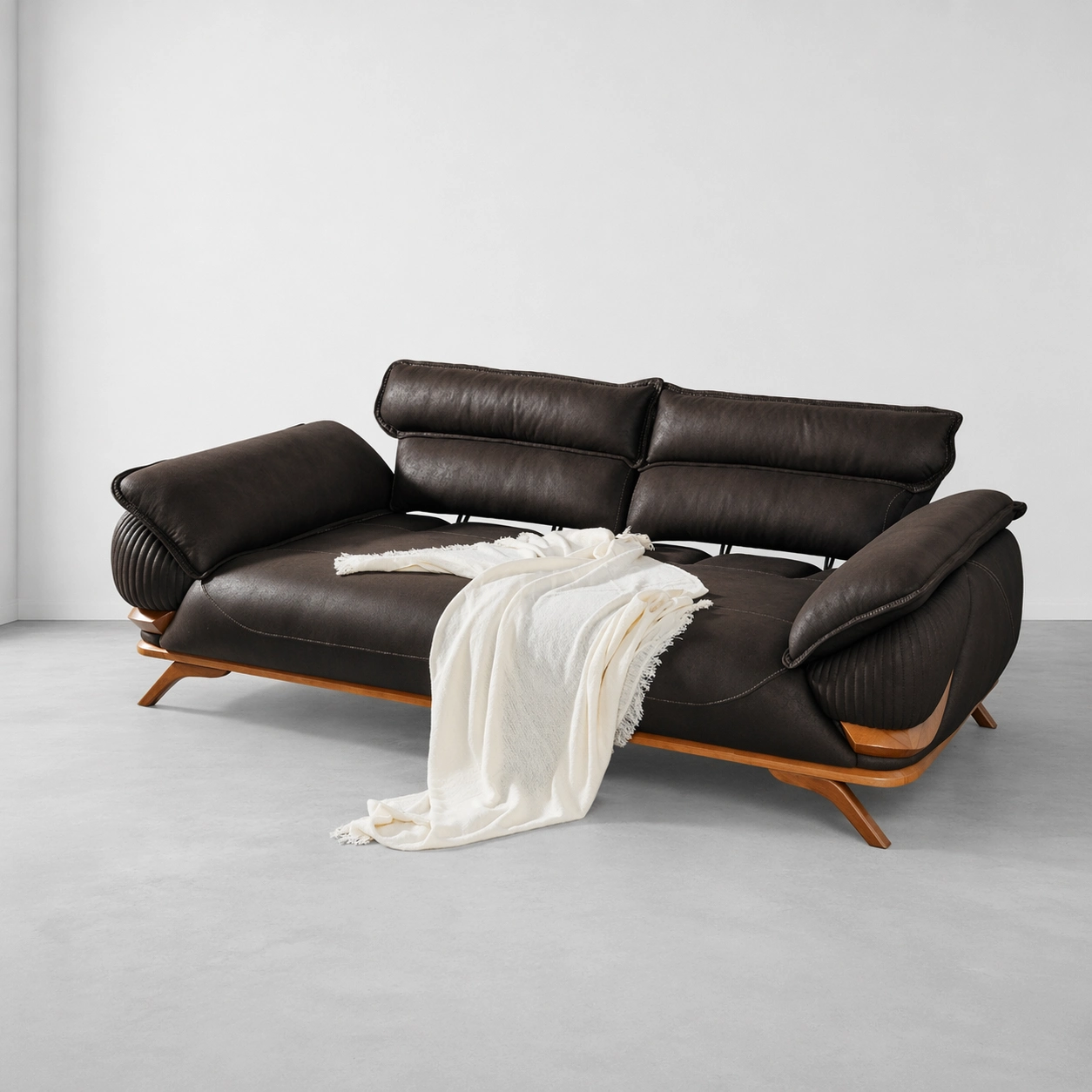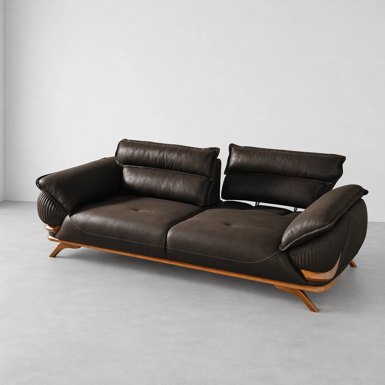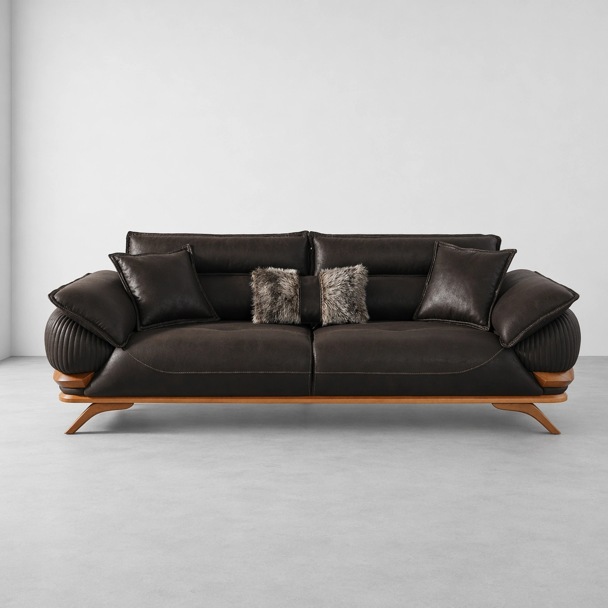 This sofa features broad seating comfort, adjustable-style back cushions, soft padded arms, ribbed side detailing, contrast stitching, and a clean contemporary profile. The combination of black upholstery and natural wooden base creates a strong luxury statement, making it suitable for both modern and classic interiors black leatherette sofa.