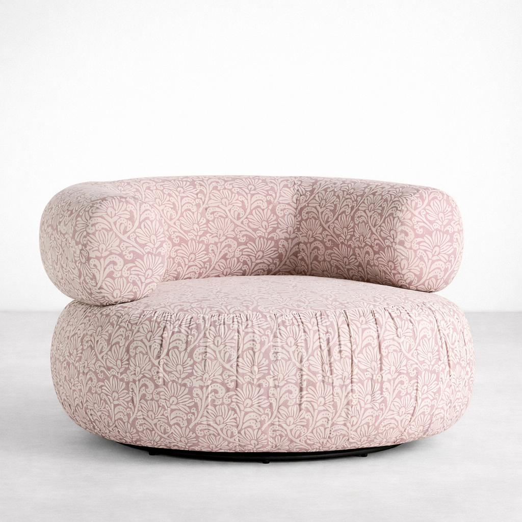 • Blush pink floral swivel chair front view with rounded wraparound back