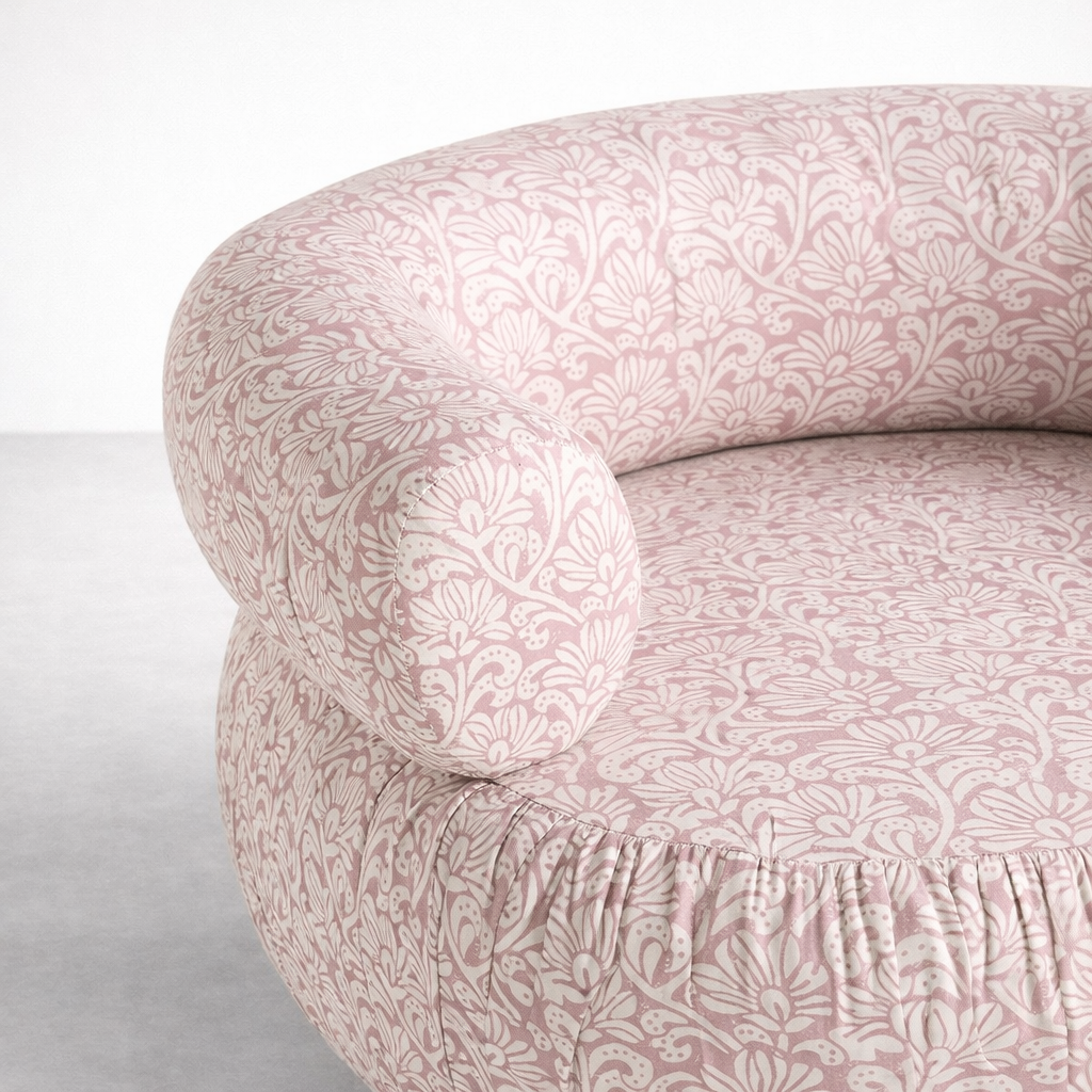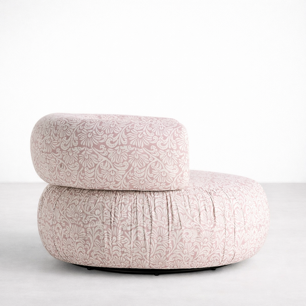 • Blush pink floral swivel chair upholstery close-up with rounded armrest