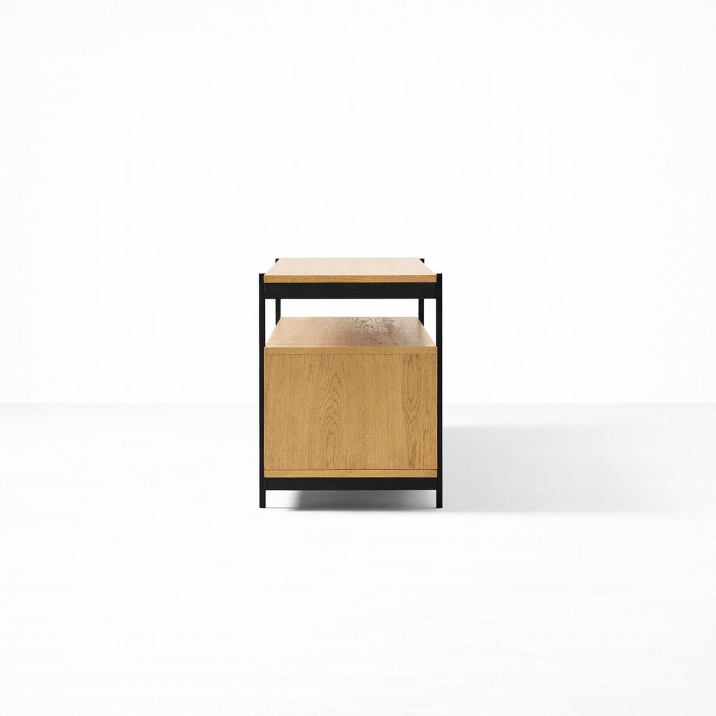 The form of the Bridge Shelf Ash Wood Media Console is simple, but its proportions give it a calm and distinctive identity. The open upper shelf adds lightness and display value, while the enclosed lower cabinet keeps the space organized. This makes the piece suitable as a TV unit, entertainment console, storage cabinet, or long media console for modern homes.