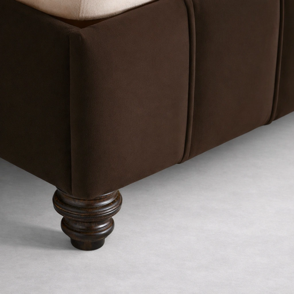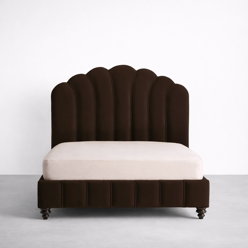 The INTERIORZE Cocoa Shell brown upholstered bed is designed to bring warmth and a quiet sense of luxury to the bedroom. The headboard uses a scallop panel shape with clean vertical sections, giving it a gentle, structured look. The fully upholstered base keeps the form neat, while classic turned legs add a grounded finish. Each bed is made to order, and we try to keep the upholstery lines clean and the build sturdy for everyday comfort Brown upholstered bed.
