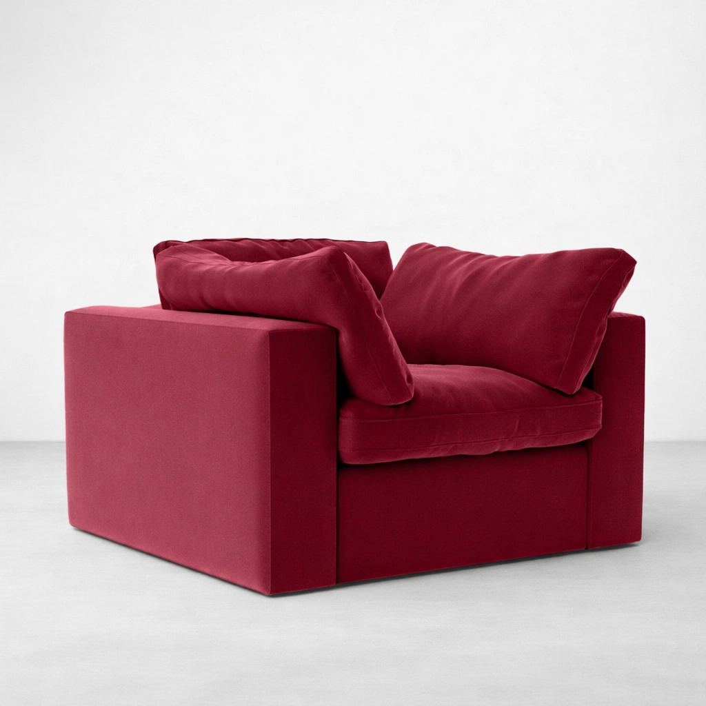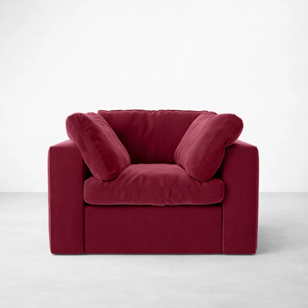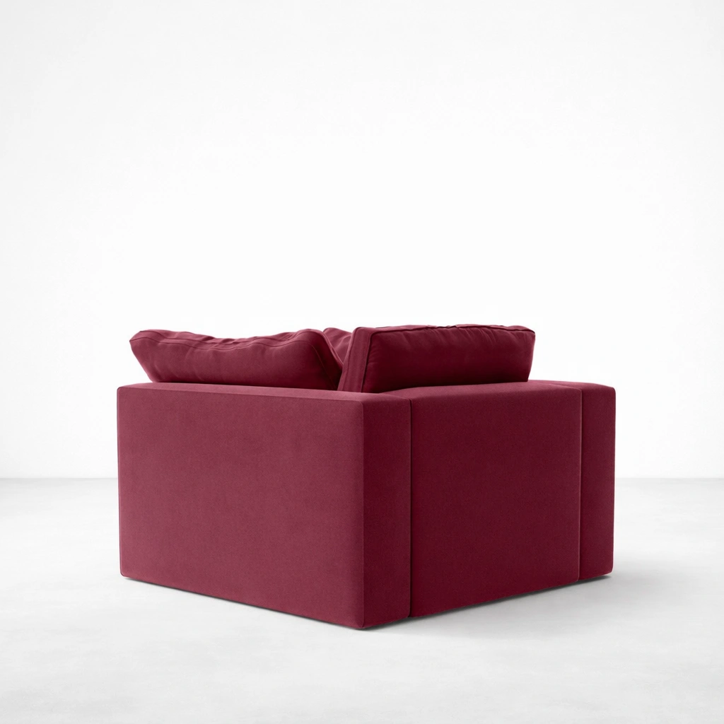 RUBYLOFT from INTERIORZE is a burgundy velvet lounge chair with teakwood legs designed to bring warmth and depth to a room without feeling loud. The deep ruby upholstery looks refined in natural light, while the broad seat and soft cushions invite you to sit longer. It works well as a statement accent chair in living rooms, bedrooms, studios, and quiet reading corners burgundy velvet lounge chair with teakwood legs.