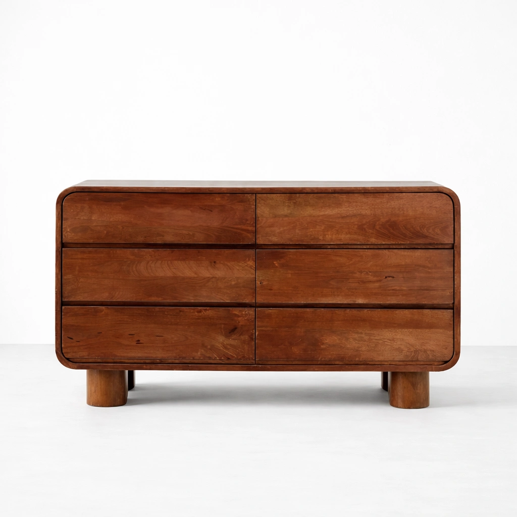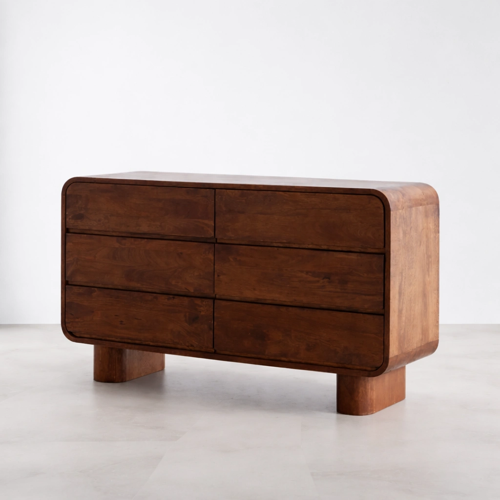 The INTERIORZE Caldera Curve Teak Wood Chest of Drawers is thoughtfully created for interiors that value simplicity, warmth, and functional storage. Made in teak wood, this chest of drawers features a clean six-drawer layout, softly rounded corners, a balanced low-profile silhouette, and a smooth front that allows the natural beauty of the wood grain to remain the highlight of the design.