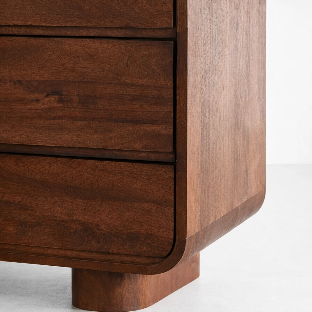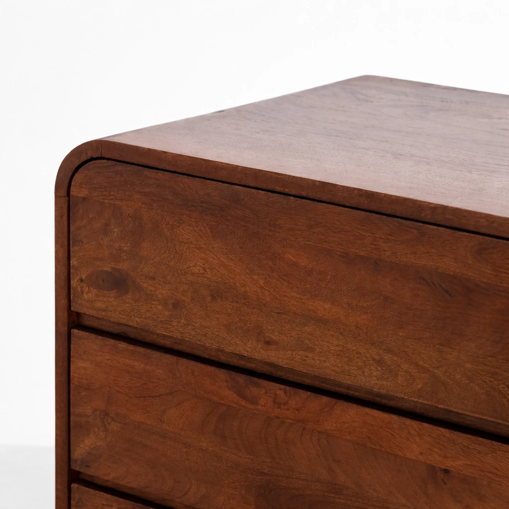 The form of the Caldera Curve Teak Wood Chest of Drawers is simple, but its quiet detailing gives it a memorable identity. The softened corners, uninterrupted wood expression, and balanced structure make it suitable for modern interiors that prefer understated elegance. It is not overly decorative, yet it carries strong visual warmth through material, proportion, and finish.