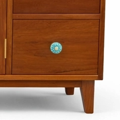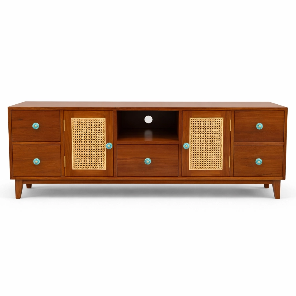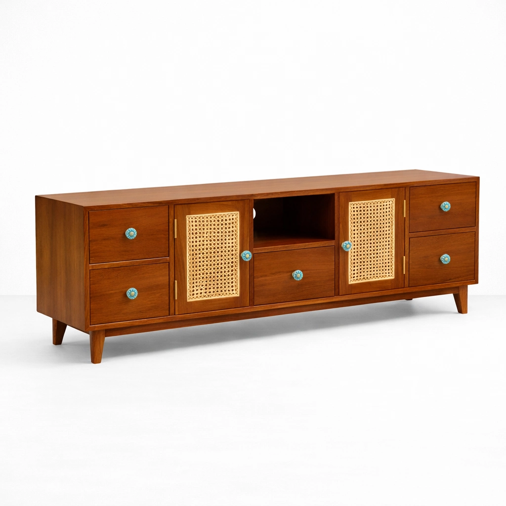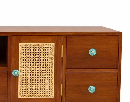 Its teak wood construction highlights the natural grain, warm tonal richness, and lasting character of the material, giving the piece a welcoming and composed look. The woven cane panels add texture and softness to the front, while the blue accent knobs introduce a subtle decorative detail that gives the design a memorable identity. The combination of drawers, cabinet storage, and open shelving makes the overall composition feel balanced, functional, and visually refined.