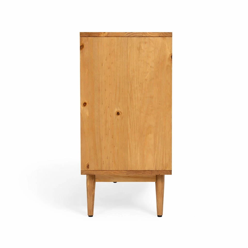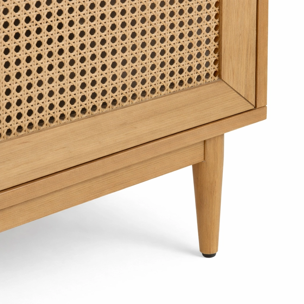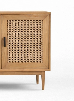 Its ash wood construction highlights the natural grain, soft tonal warmth, and understated character of the material, giving the piece a calm and welcoming look. The framed cane door panels add texture and visual softness, while the clean outer profile keeps the overall form refined and versatile. The proportions feel balanced and minimal, yet the cane detailing and slim legs give the console a distinct identity.