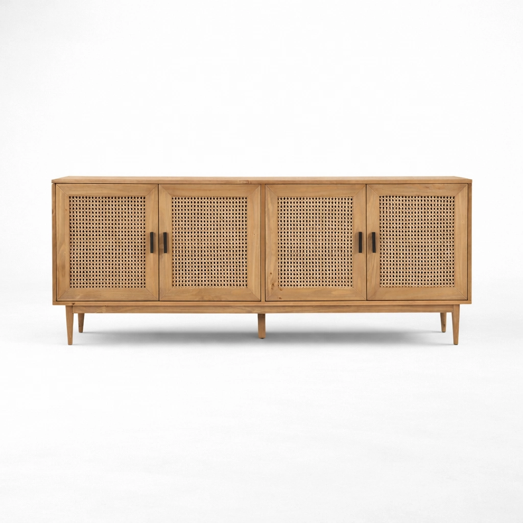 The form of the Cane Frame Ash Wood Media Console is simple, but its proportions give it a quiet and memorable identity. The cane-front doors soften the look, while the ash wood frame keeps the design grounded and elegant. The raised leg base adds a light mid-century character that makes the piece suitable as a TV unit, media cabinet, entertainment console, or long storage console for interiors that value both utility and understated design.