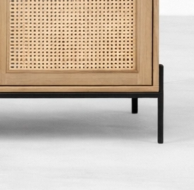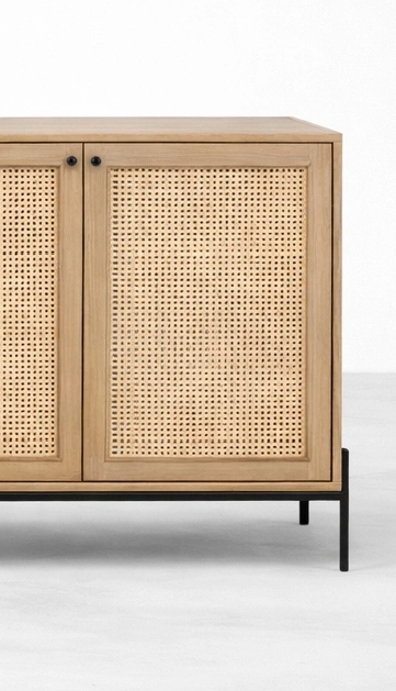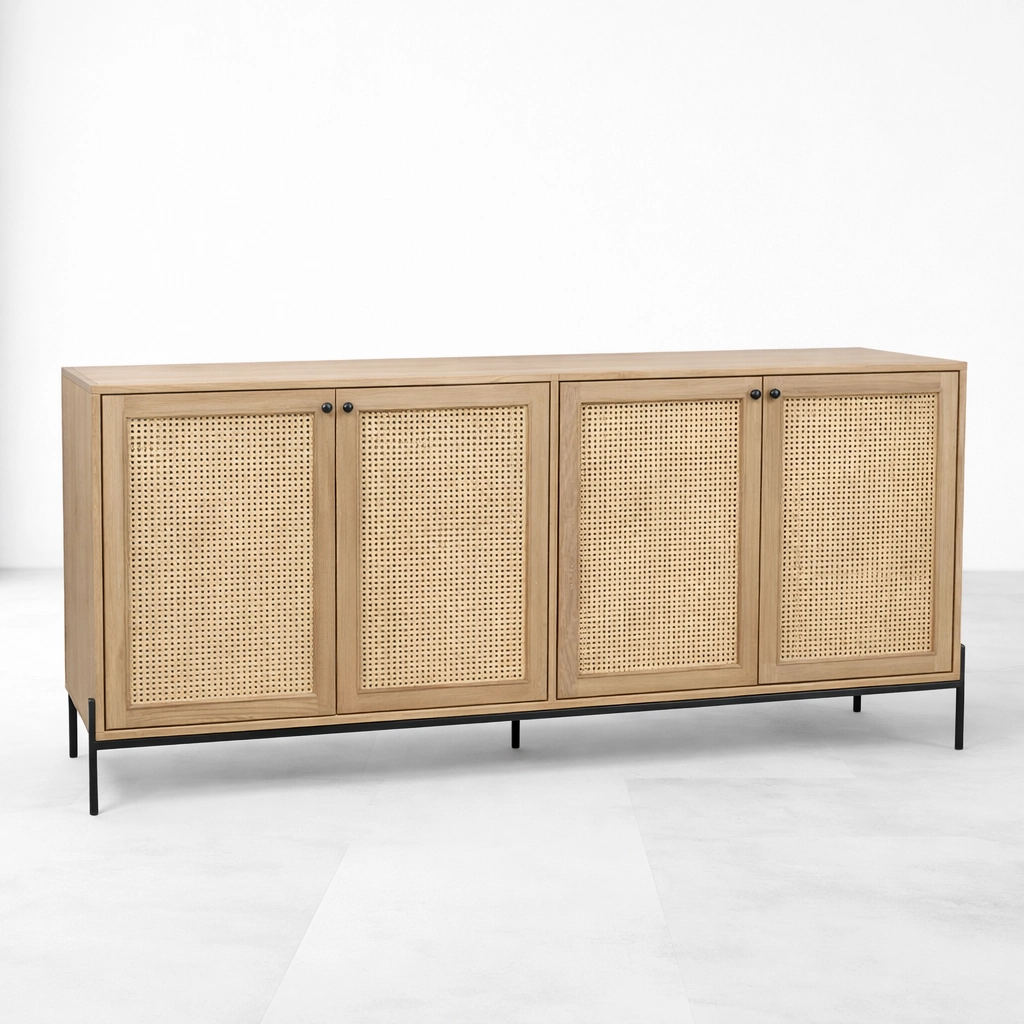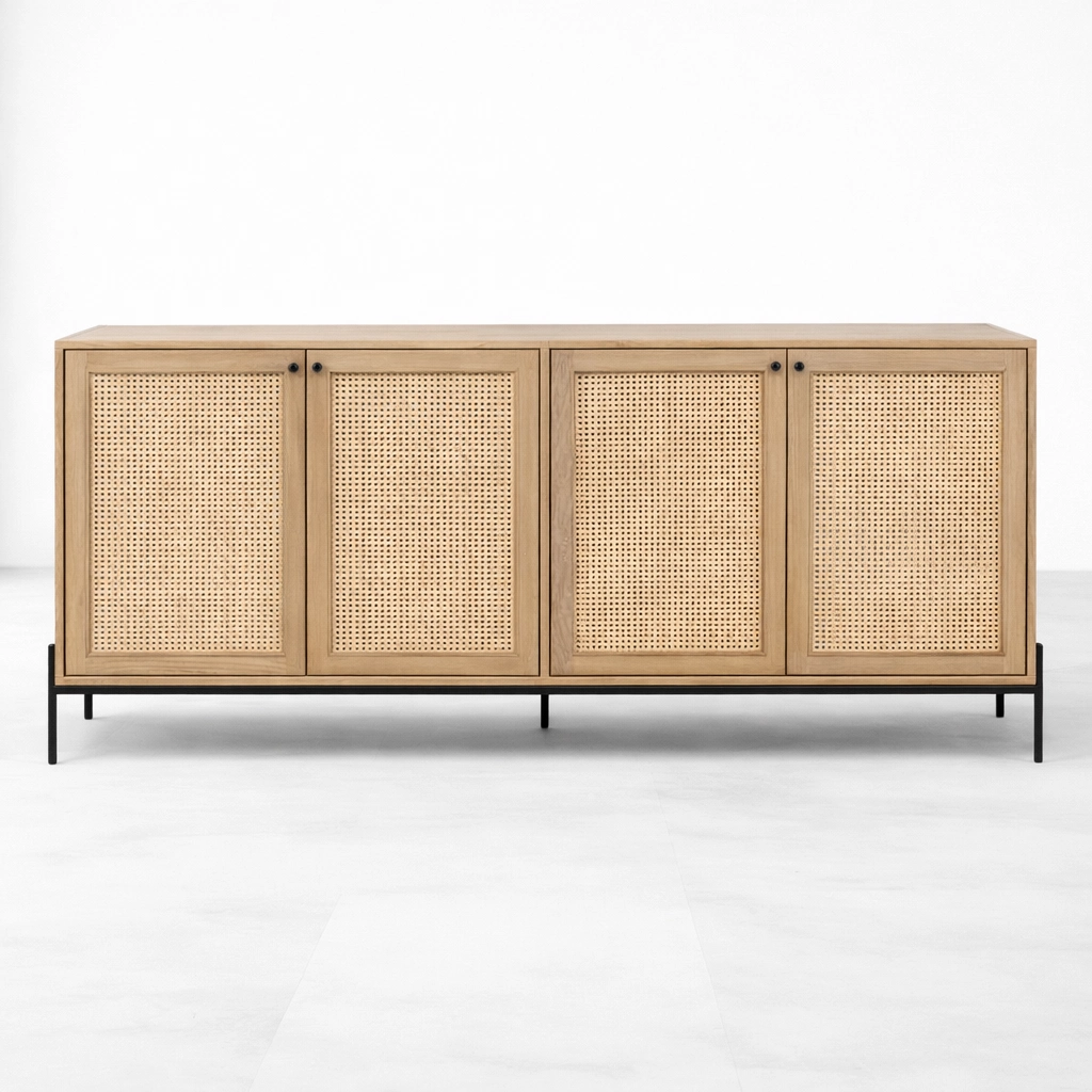 The form of the Cane Frame Ash Wood Sideboard is simple, but its proportions and material contrast give it a calm and memorable identity. The light wood body keeps the look warm and versatile, the woven cane panels add texture, and the black metal base gives the piece a more contemporary edge. This makes the piece suitable as a sideboard, buffet cabinet, storage console, or long utility cabinet for interiors that value both function and understated design.