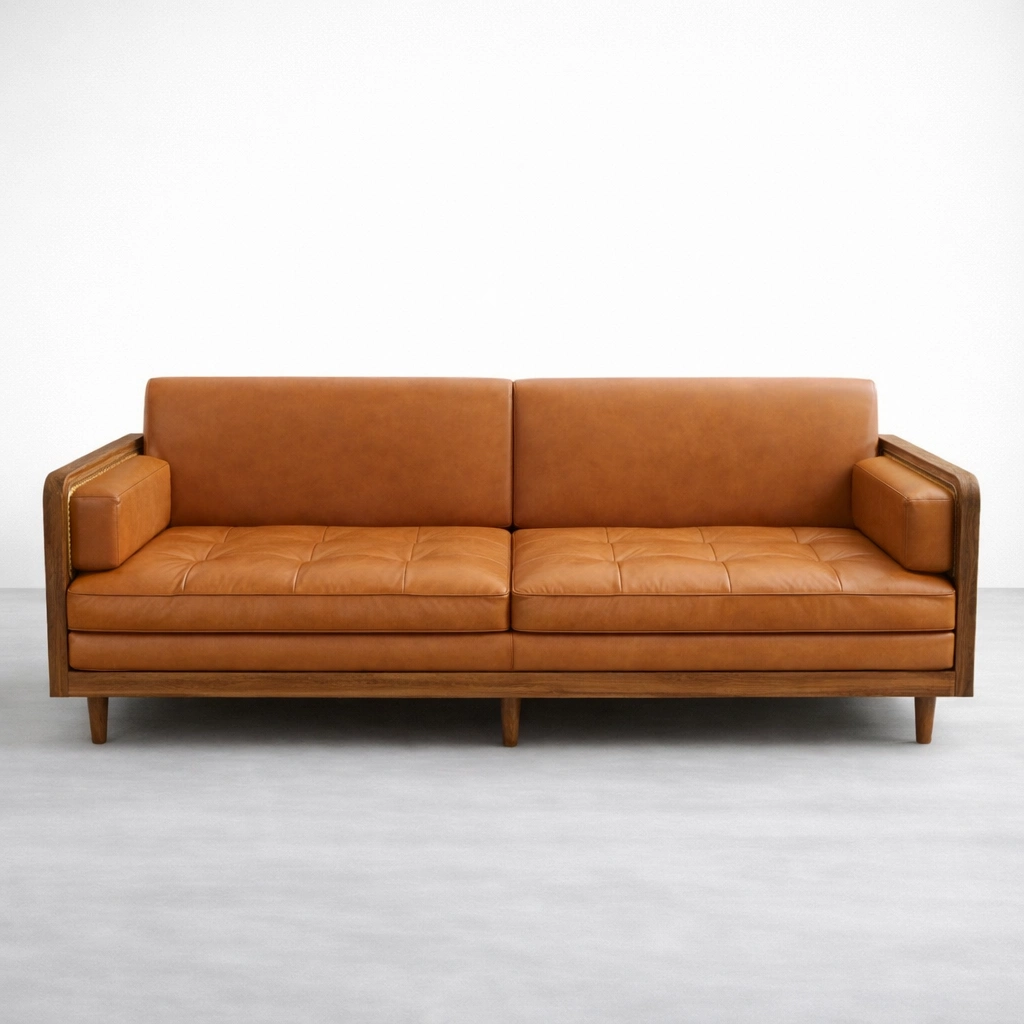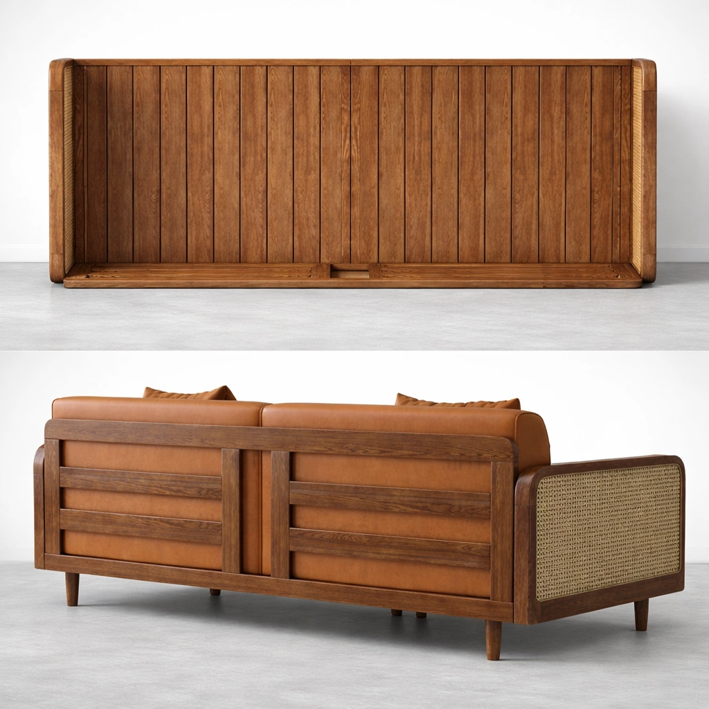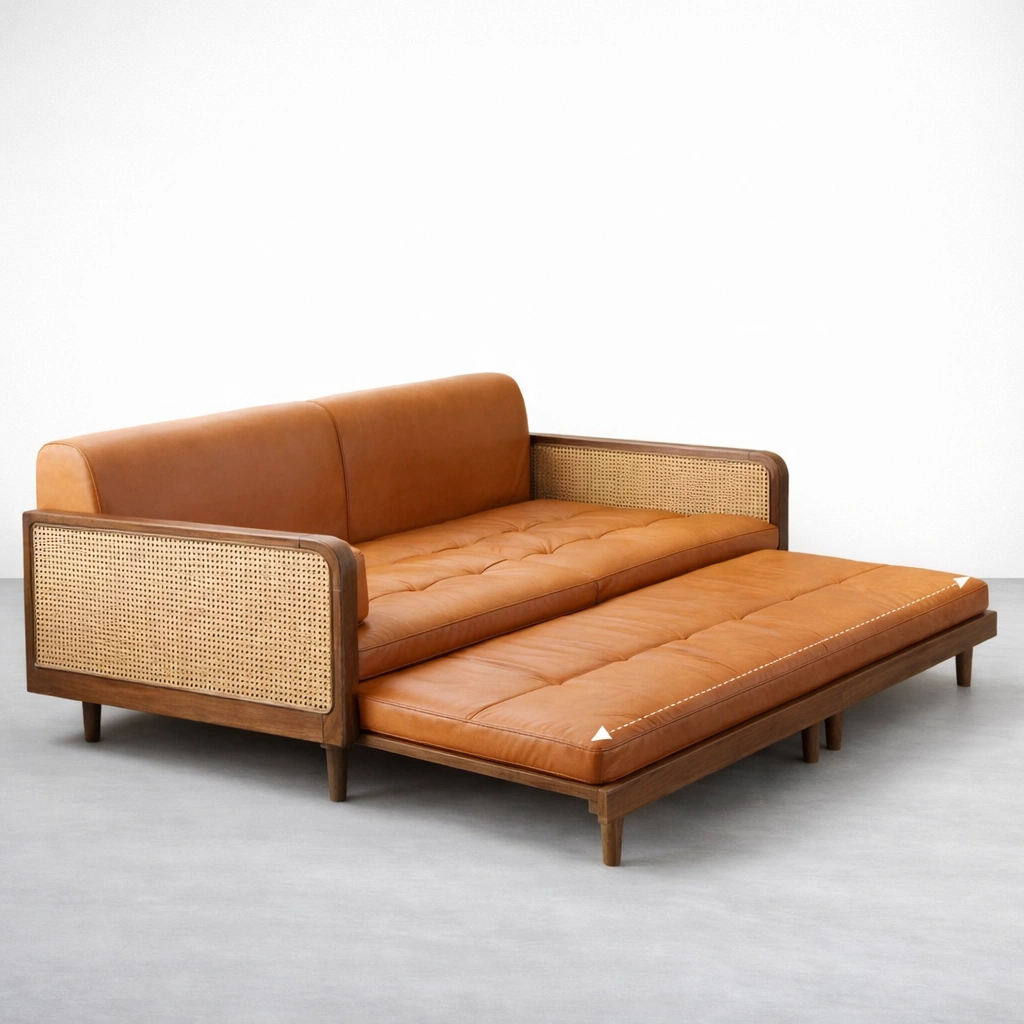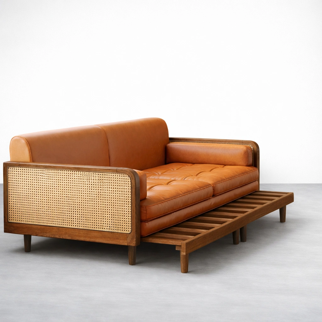 The frame is crafted in solid teakwood for strength and long-term stability. Cane webbing side panels add a light, handcrafted texture that balances the warm wooden tone and the tan leather finish . The overall silhouette stays timeless, with tapered legs and a calm, structured profile that suits modern, mid-century, and classic interiors Cane Panel Teakwood Sofa Cum Bed.