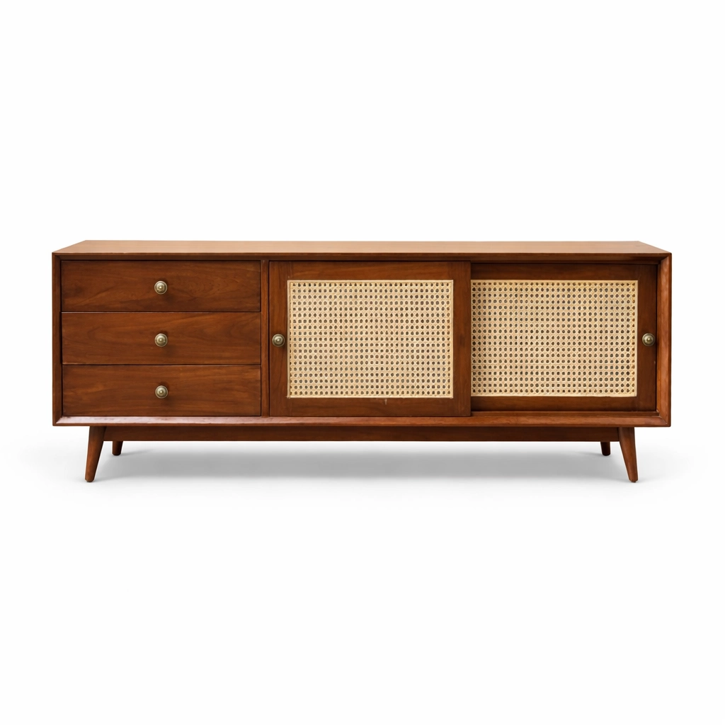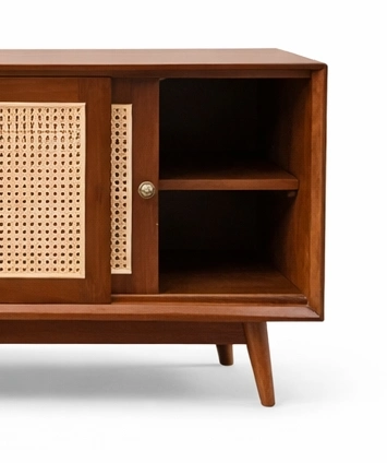 Its teak wood construction highlights the natural grain, warm tonal richness, and lasting character of the material, giving the piece a welcoming and composed look. The woven cane-front sliding doors introduce texture and visual lightness, while the drawer section and open inner compartments create a useful storage rhythm across the front. The slim tapered legs add a subtle mid-century character and help the console feel light while still grounded.