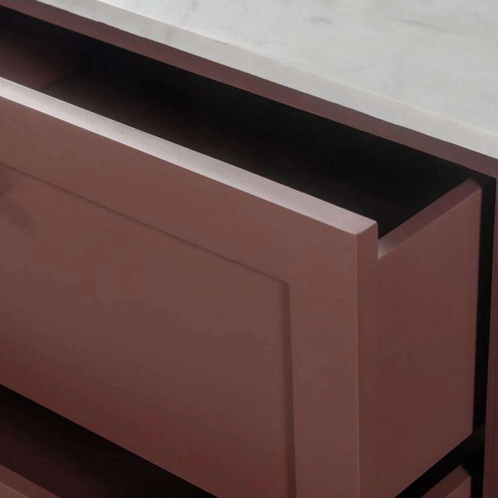 • INTERIORZE Carmine Marble Top Teak Wood Sideboard drawer detail with painted frame and marble-look top